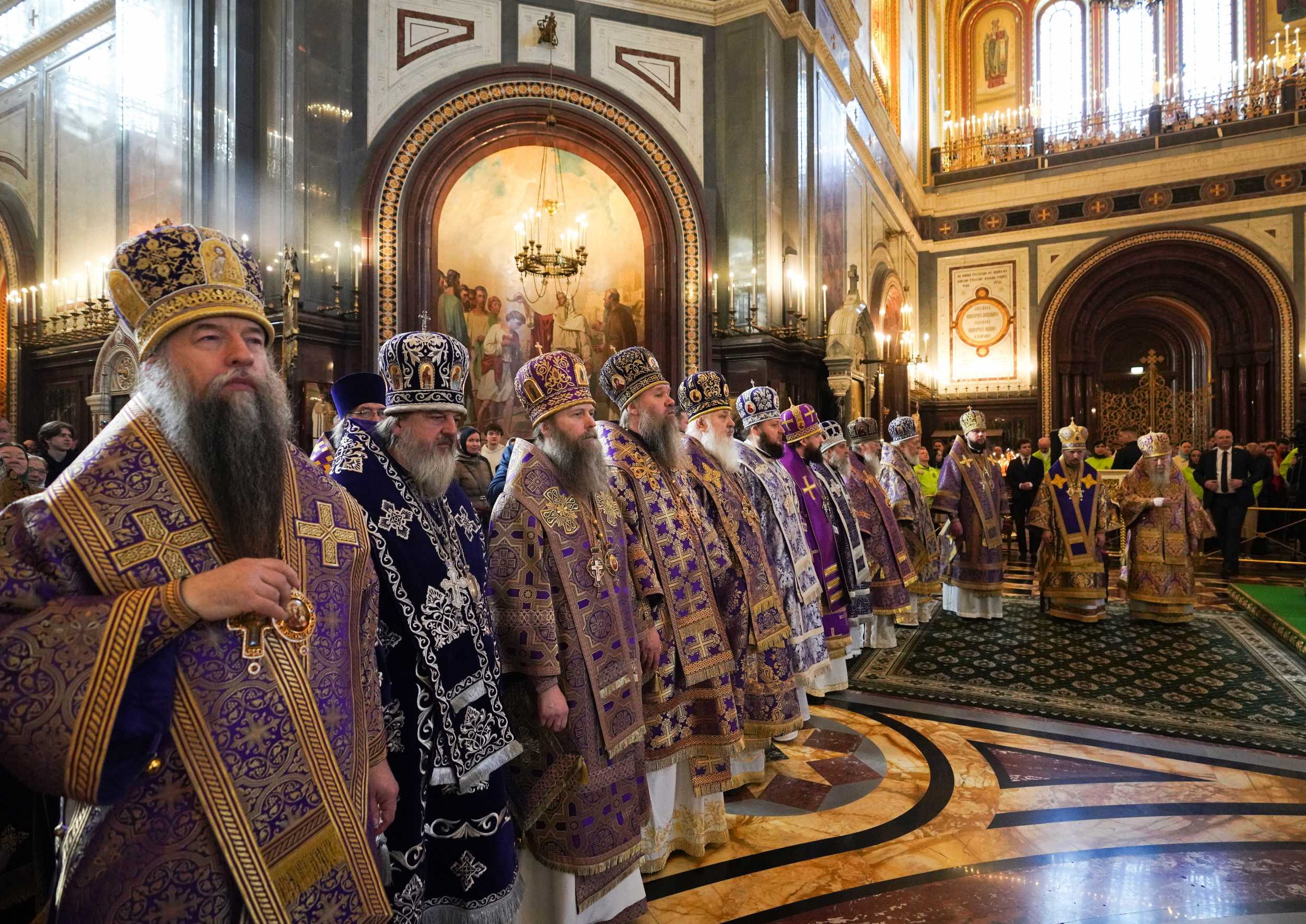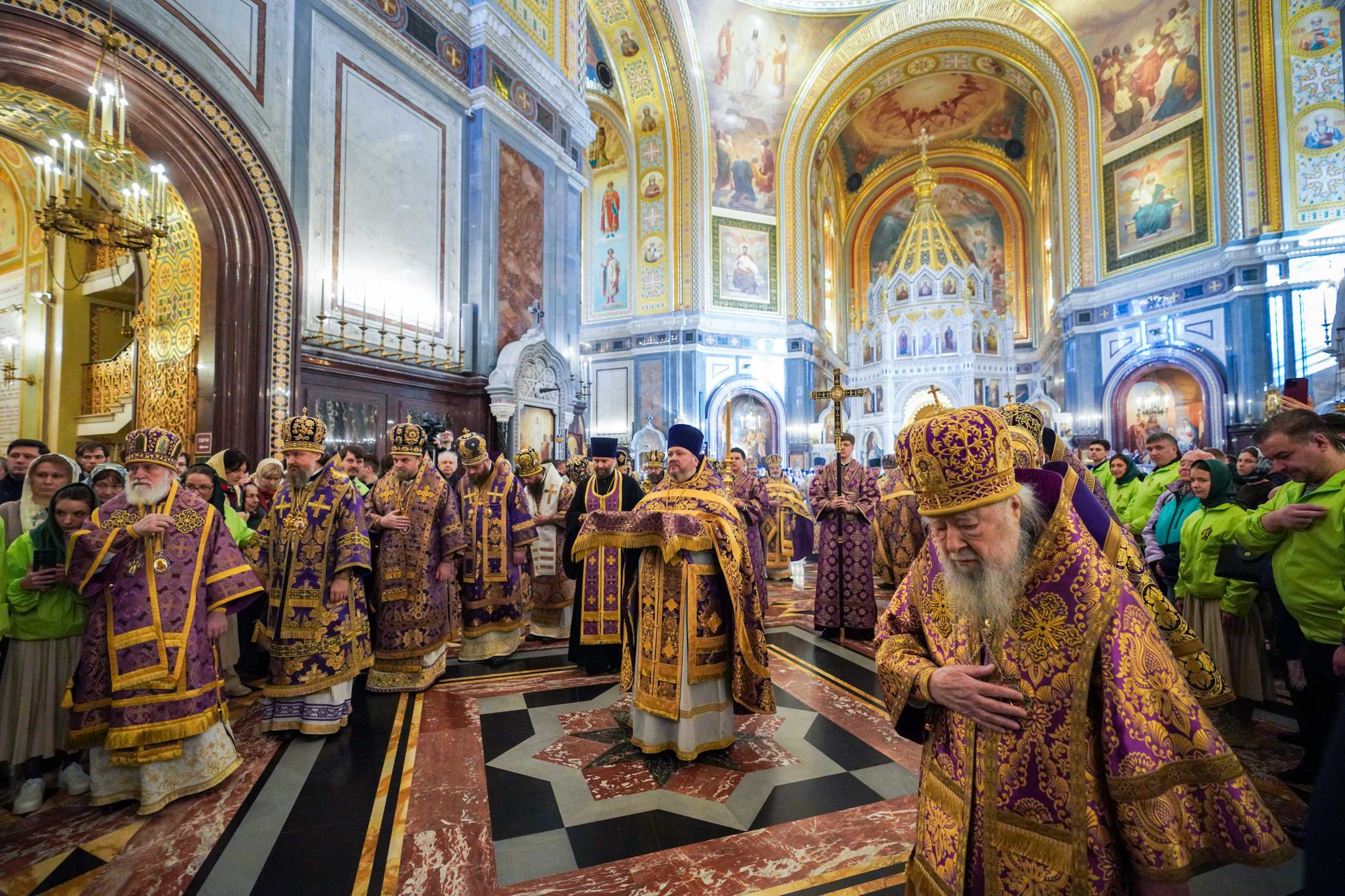 За Литургией Его Святейшеству сослужили: митрополит Ювеналий (Поярков); митрополит Крутицкий и Коломенский Павел, Патриарший наместник Московской митрополии; митрополит Минский и Заславский Вениамин, Патриарший экзарх всея Беларуси; митрополит Воскресенский Григорий, управляющий делами Московской Патриархии, первый викарий Патриарха Московского и всея Руси по г. Москве, наместник Новоспасского ставропигиального монастыря; митрополит Владимирский и Суздальский Никандр, председатель Финансово-хозяйственного управления Московского Патриархата; митрополит Казанский и Татарстанский Кирилл; митрополит Балтийский и Светлогорский Серафим, Патриарший наместник Калининградской митрополии; митрополит Волгоградский и Камышинский Феодор; митрополит Каирский и Северо-Африканский Константин, Патриарший экзарх Африки; митрополит Звенигородский Арсений; митрополит Екатеринбургский и Верхотурский Евгений, председатель Синодального отдела религиозного образования и катехизации; архиепископ Одинцовский и Красногорский Фома, руководитель Административного секретариата Московской Патриархии; архиепископ Подольский и Люберецкий Аксий; архиепископ Зеленоградский Савва, заместитель управляющего делами Московской Патриархии, председатель Синодального миссионерского отдела; епископ Видновский Тихон, наместник Екатерининского ставропигиального монастыря; епископ Серпуховской Роман, наместник Высоцкого ставропигиального монастыря; епископ Канашский и Беловолжский Стефан; епископ Балашихинский и Орехово-Зуевский Николай, главный редактор Издательства Московской Патриархии; епископ Павлово-Посадский Силуан, заместитель управляющего делами Московской Патриархии; епископ Истринский Серафим, первый заместитель председателя Издательского Совета Русской Православной Церкви; епископ Сергиево-Посадский и Дмитровский Кирилл, наместник Свято-Троицкой Сергиевой лавры, ректор Московской духовной академии; епископ Раменский Алексий, личный секретарь Святейшего Патриарха Кирилла; епископ Егорьевский Мефодий, и.о. председателя Синодальной библейско-богословской комиссии, ректор Православного Свято-Тихоновского гуманитарного университета, наместник Николо-Угрешского ставропигиального монастыря; епископ Бронницкий Иоанн, наместник Высоко-Петровского ставропигиального монастыря; протопресвитер Владимир Диваков, секретарь Патриарха Московского и всея Руси по г. Москве; протоиерей Михаил Рязанцев, ключарь Храма Христа Спасителя; протоиерей Николай Балашов, советник Патриарха Московского и всея Руси; протоиерей Максим Козлов, председатель Учебного комитета Русской Православной Церкви; протоиерей Дионисий Казанцев, секретарь Патриарха Московского и всея Руси по Московской области; иерей Василий Лосев, руководитель секретариата Всемирного русского народного собора, руководитель юридической службы Московской митрополии; наместники ставропигиальных монастырей, благочинные церковных округов г. Москвы и столичное духовенство.