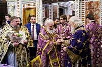 По прибытии в храм Предстоятель Русской Православной Церкви поклонился честным мощам святителя Филарета, митрополита Московского.