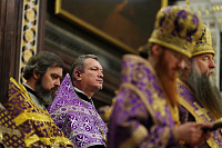 На сугубой ектении были вознесены особые прошения по случаю 50-летия со дня архиерейской хиротонии Святейшего Патриарха Кирилла, митрополит Ювеналий (Поярков) прочитал молитву. Затем Предстоятель Русской Церкви прочитал молитву о Святой Руси.
