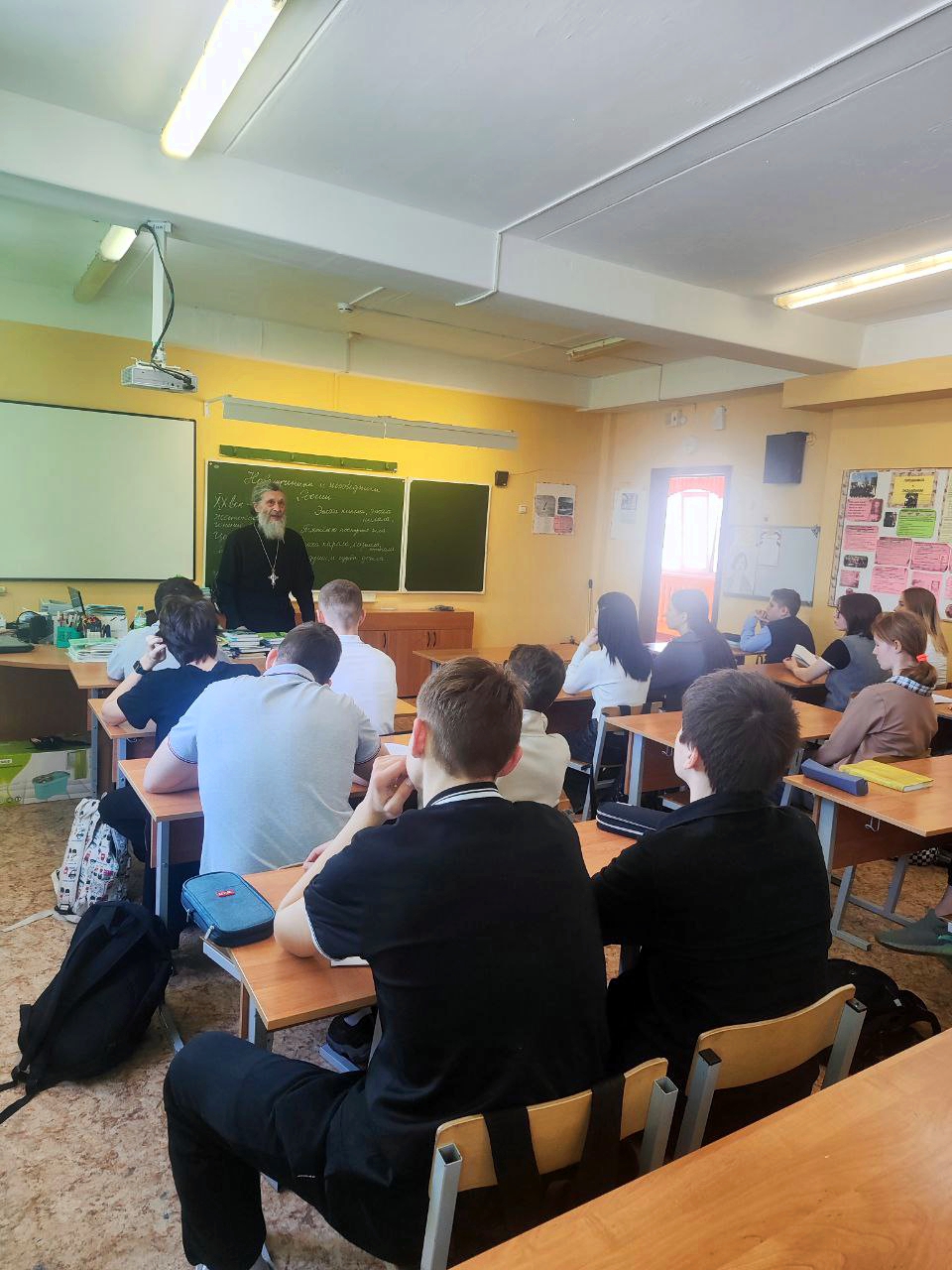 В тот же день настоятель Покровского храма села Богородское иерей Виталий Бровко провел с учениками пятых, шестых и седьмых классов Беляногорской СОШ беседу о новомучениках и исповедниках Рузских. Вместе со школьниками священник рассмотрел феномен мученичества вообще и подробно разобрал период гонений на Церковь в России в начале XX века на примере жизнеописания священномученика Николая Соколова. Уроженец Рузского уезда, выпускник Московской духовной семинарии, отец Николай многие годы служил в храмах Подмосковья, был благочинным церквей Верейского и Можайского районов, а в 1937 году принял мученическую кончину на Бутовском полигоне.