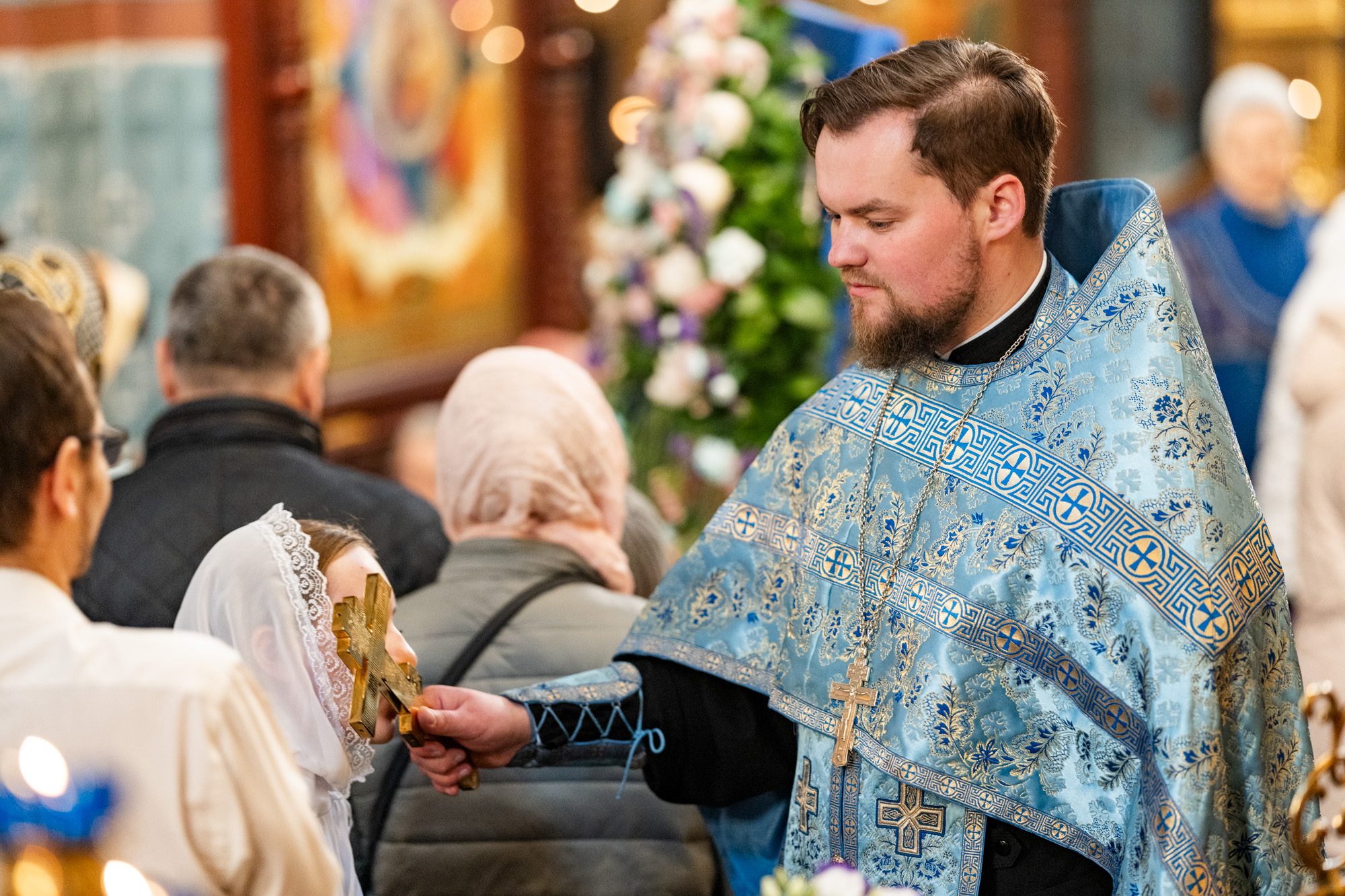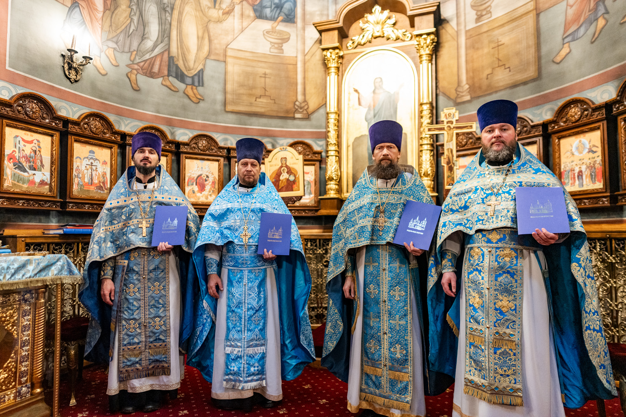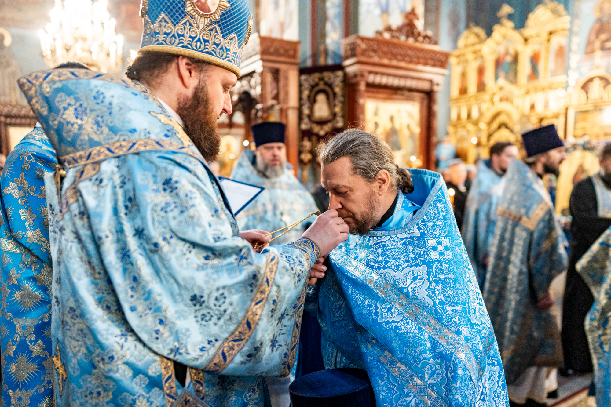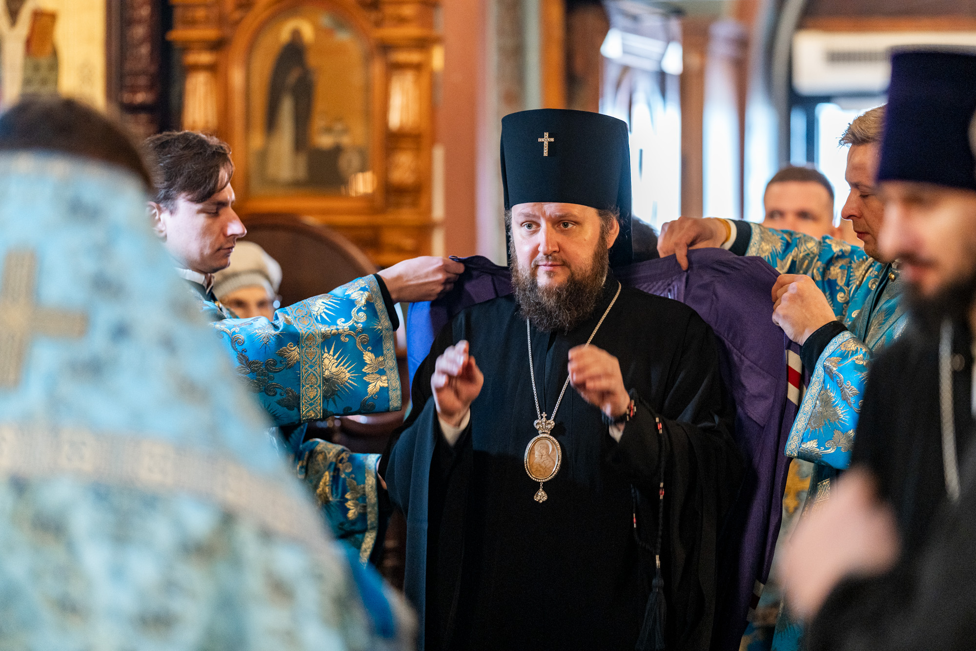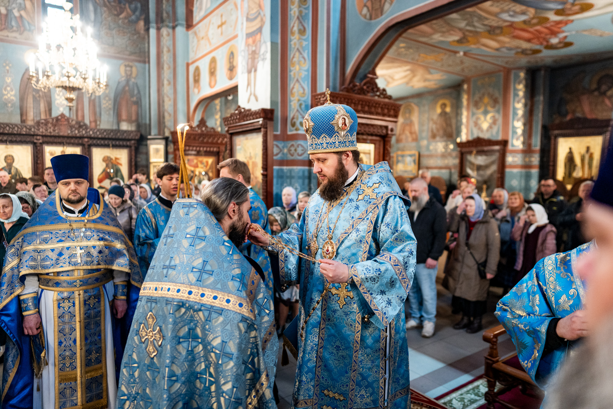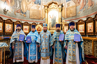 На малом входе владыка вручил клирикам Домодедовского благочиния богослужебно-иерархические награды к празднику Святой Пасхи.