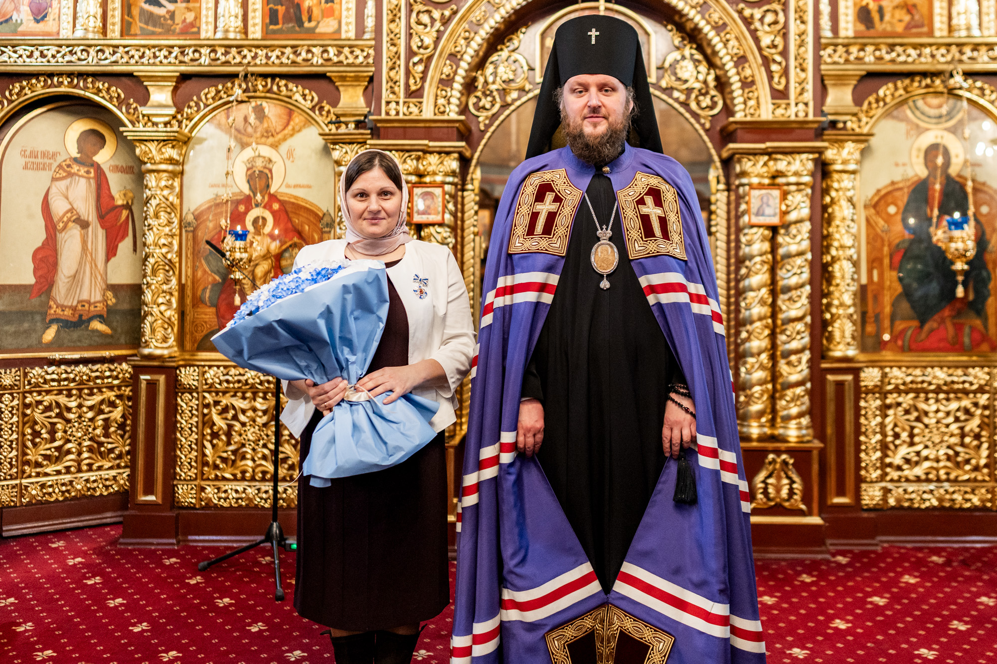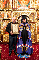 Затем владыка вручил Патриарший знак материнства II степени прихожанкам храма И.В. Литвиновой и К.И. Данилиной, а также архиерейскую грамоту руководителю компании «Благосервис» А.Г. Давтяну.