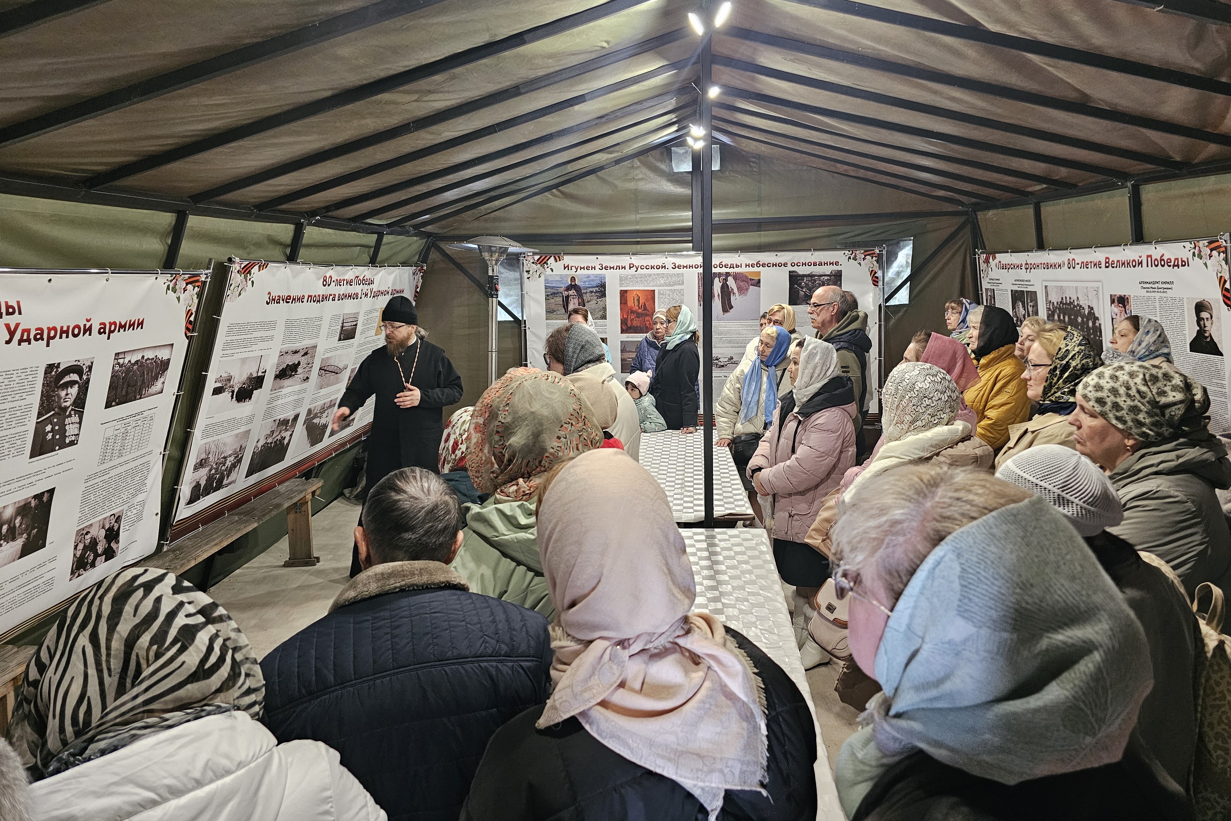 Вначале паломнической поездки в храме преподобного Сергия Радонежского д. Костино Пушкинского г.о. Ивантеевского благочиния председатель Епархиального отдела по организованному православному отдыху, паломничеству и туризму, настоятель Сергиевского храма иерей Виктор Селезнёв совершил молебен и рассказал о выставке «Лаврские фронтовики. Значение подвига воинов 1-й Ударной армии», размещённой в воинской палатке.