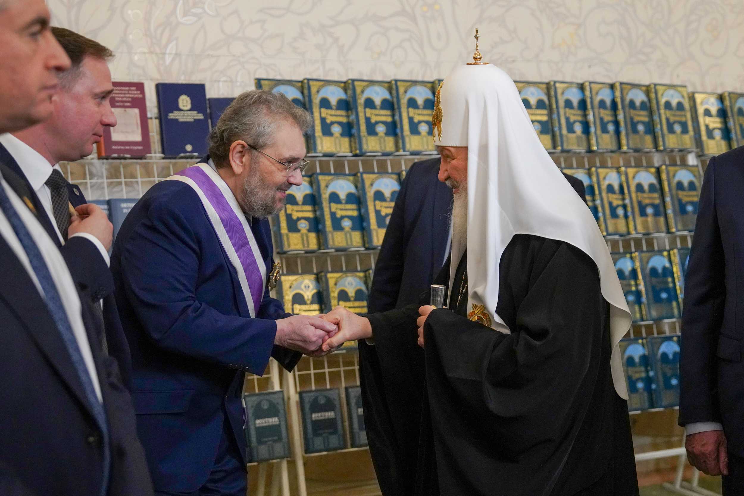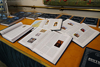 Затем Святейший Патриарх Московский и всея Руси Кирилл в сопровождении В.В. Володина, С.С. Собянина и С.Л. Кравца осмотрел стенды, на которых было представлено полное собрание томов «Православной энциклопедии».