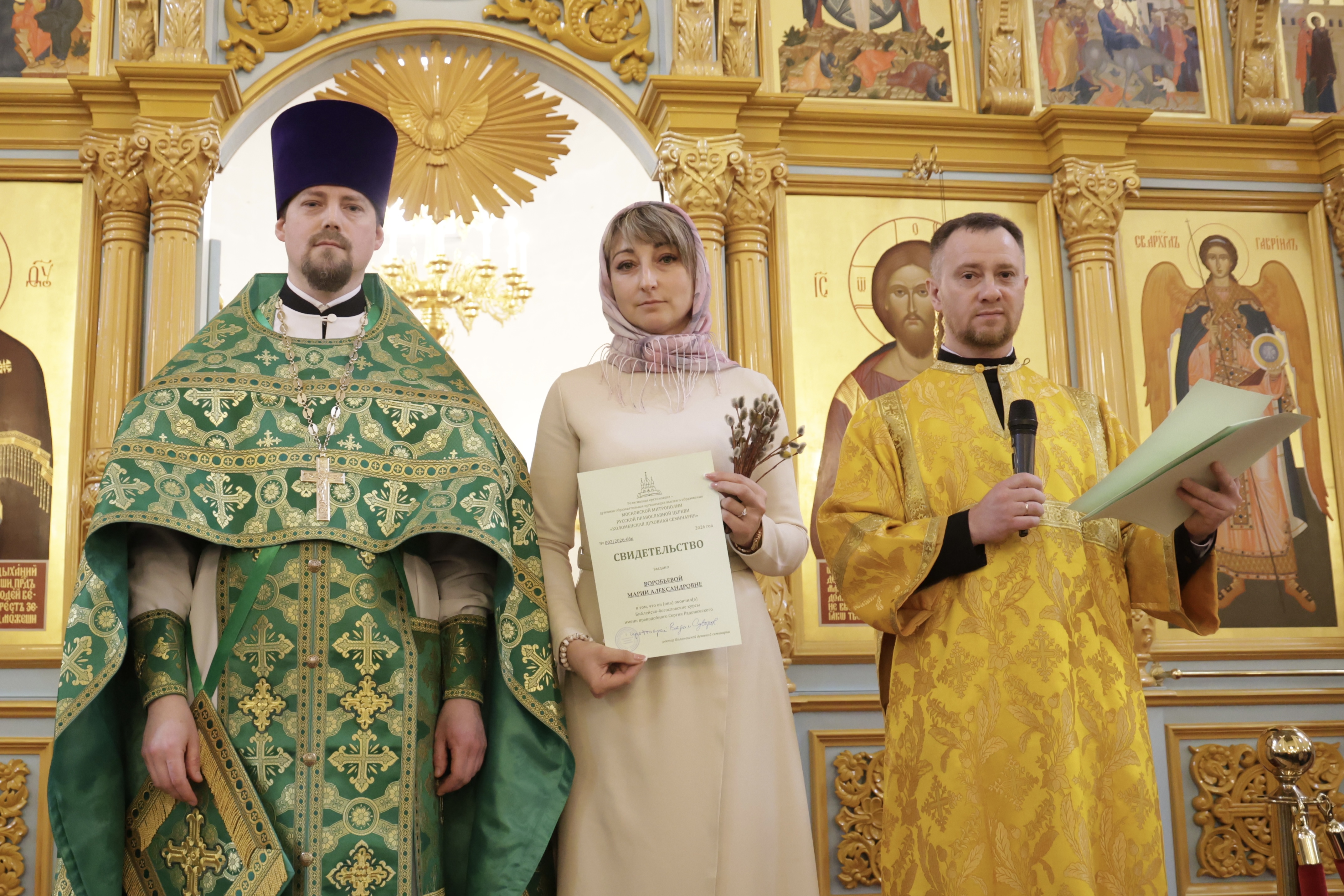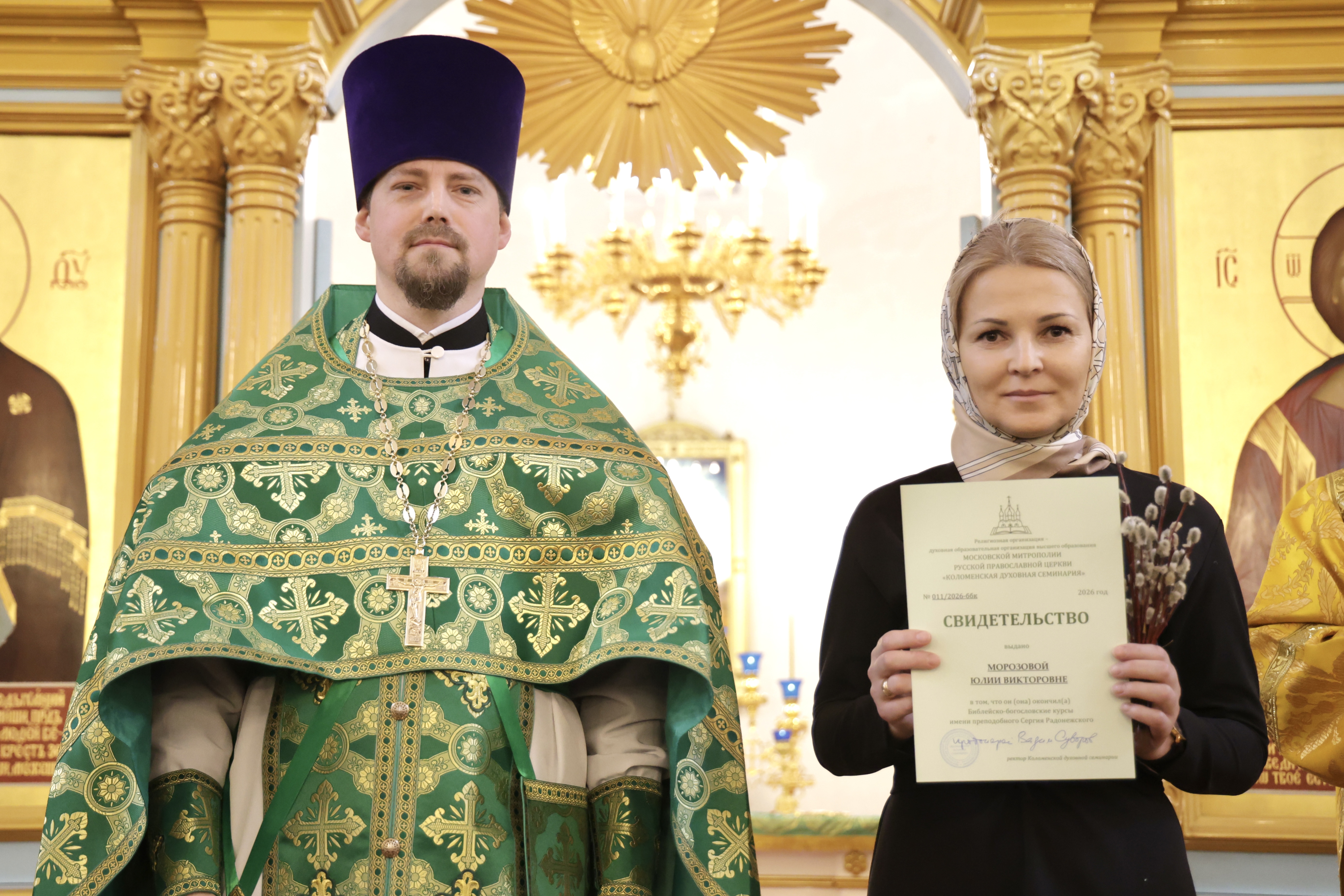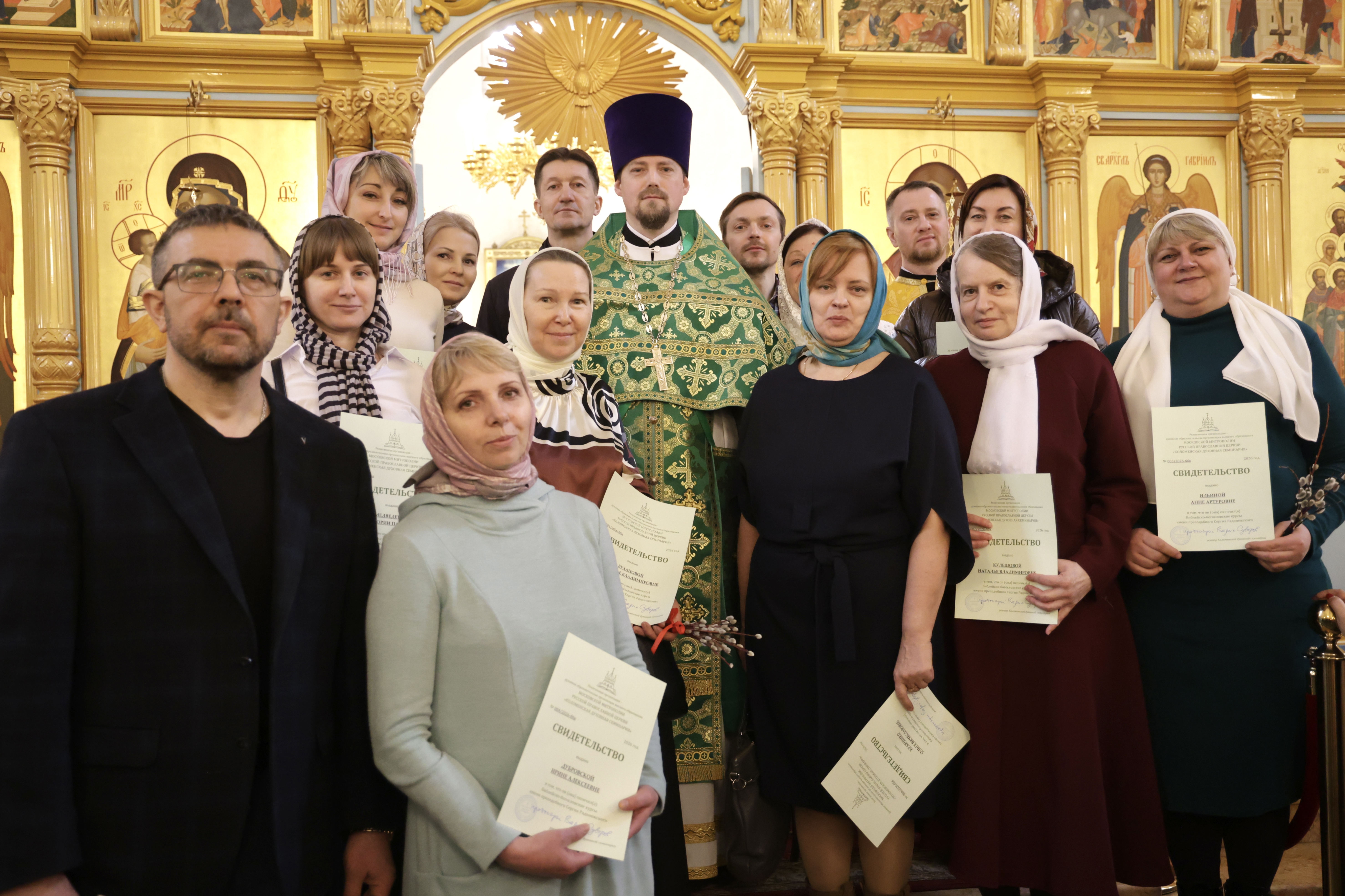5 апреля 2026 г., в праздник Входа Господня в Иерусалим, в Иерусалимском храме г. Воскресенска состоялось торжественное вручение свидетельств выпускникам епархиальных Библейско-богословских курсов имени преподобного Сергия Радонежского.