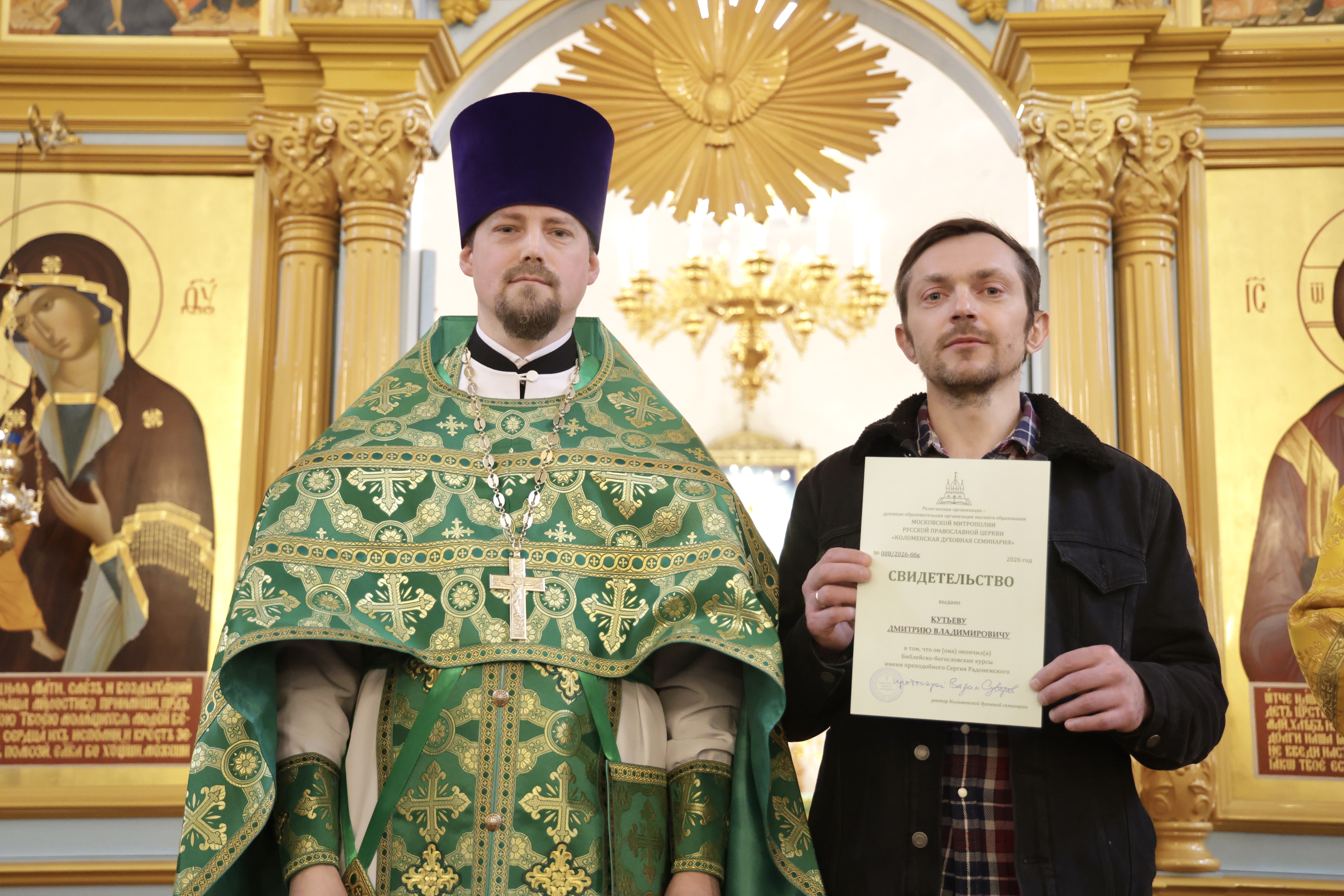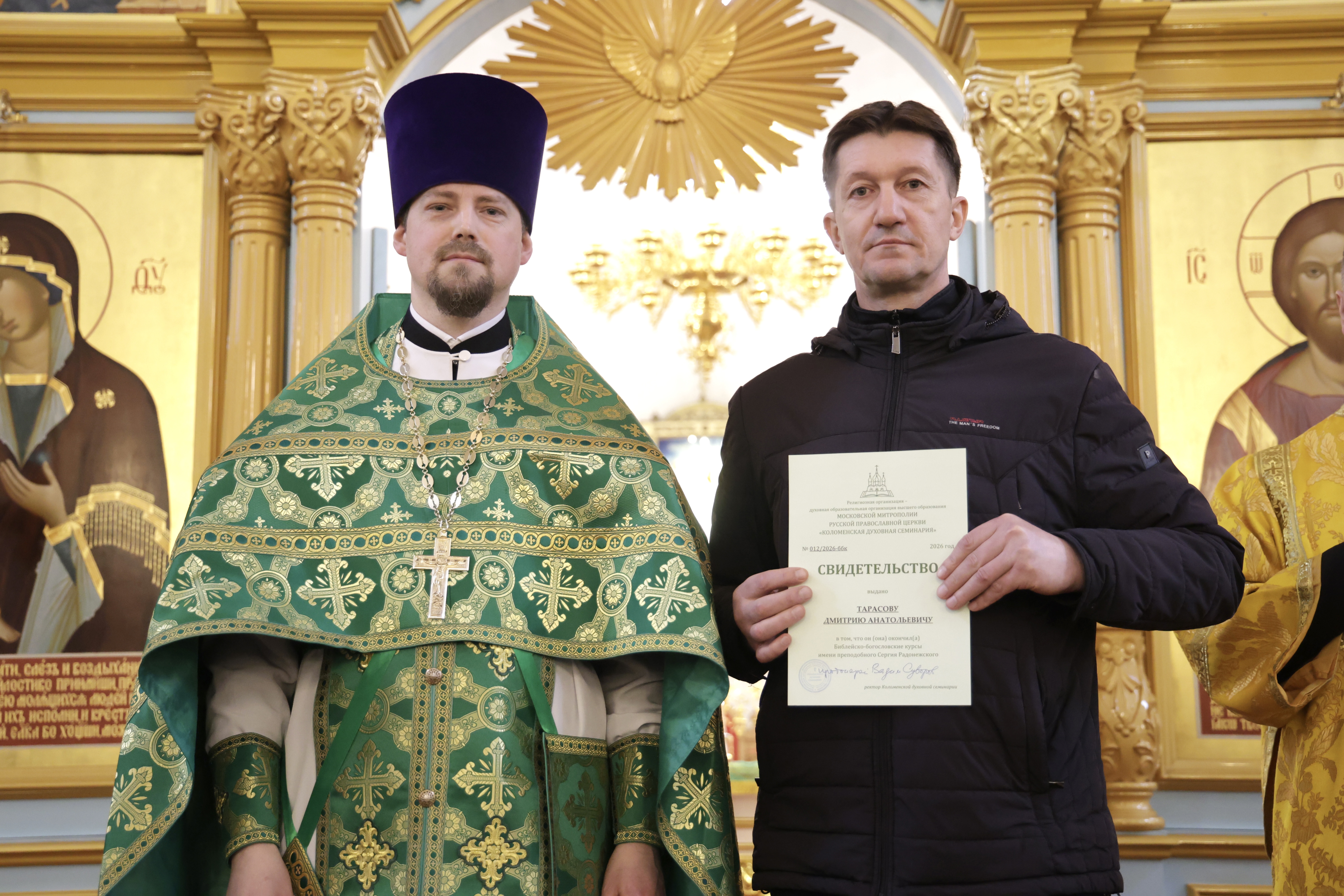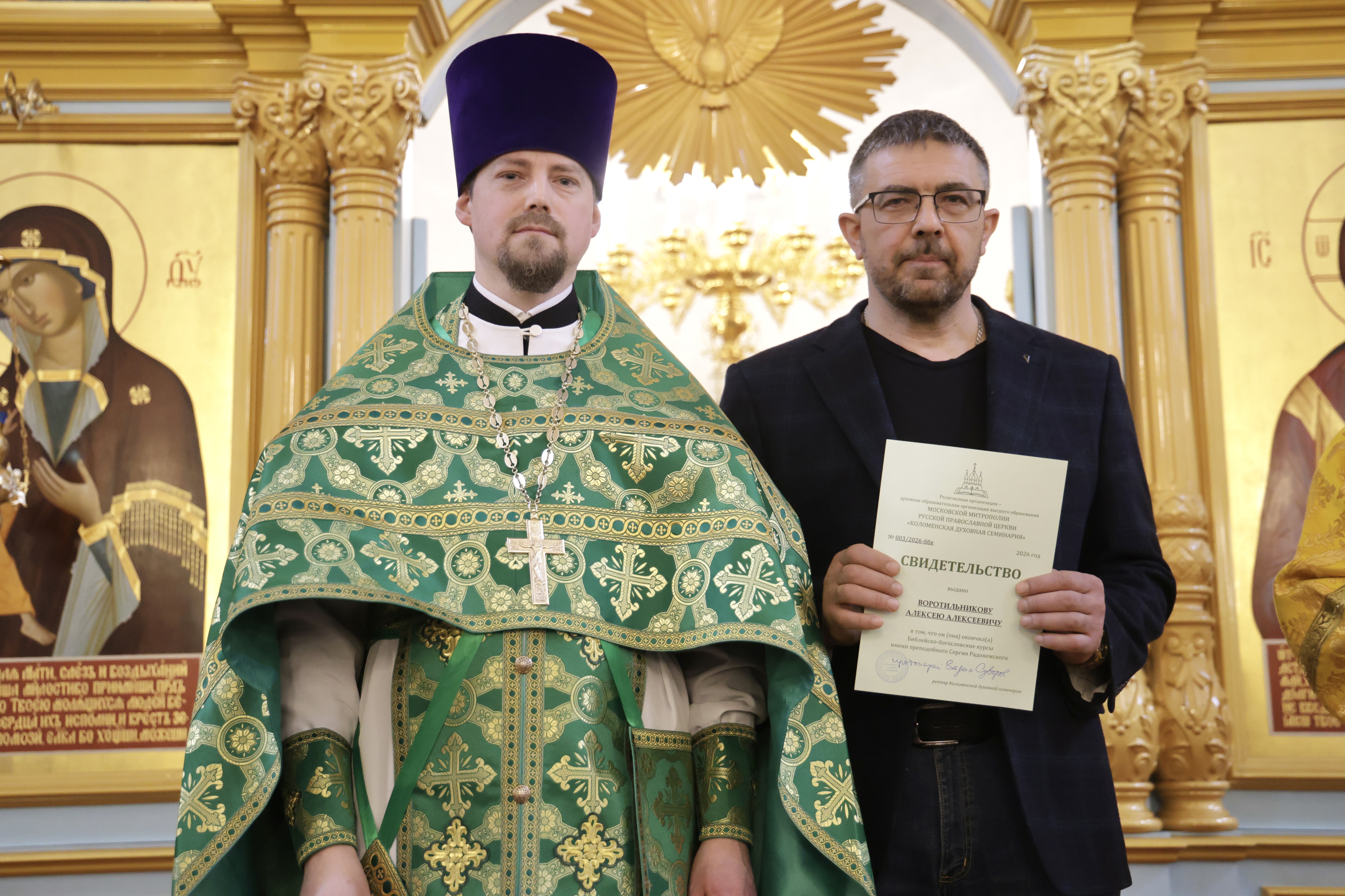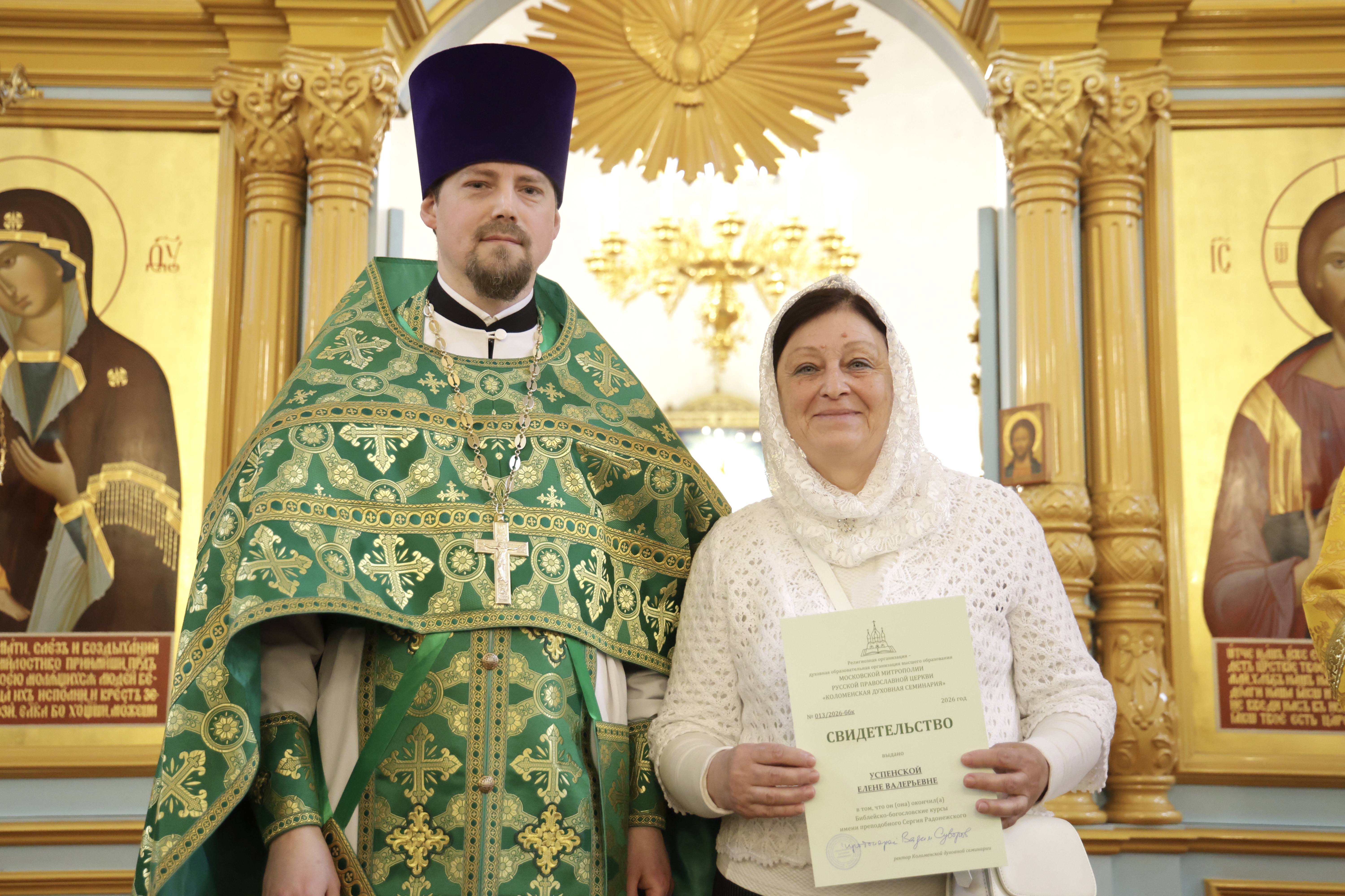 5 апреля 2026 г., в праздник Входа Господня в Иерусалим, в Иерусалимском храме г. Воскресенска состоялось торжественное вручение свидетельств выпускникам епархиальных Библейско-богословских курсов имени преподобного Сергия Радонежского.