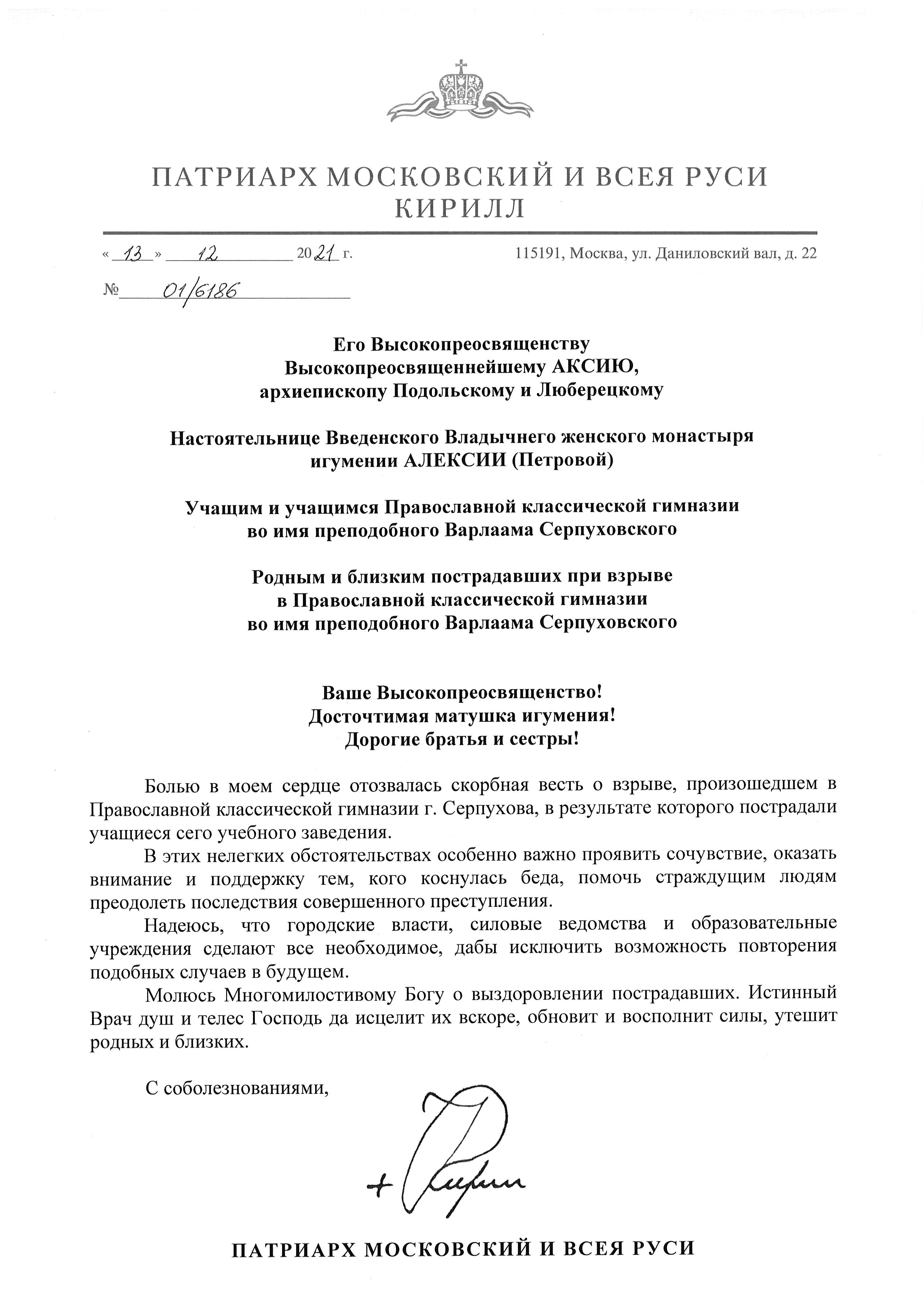 Соболезнование Святейшего Патриарха в связи с трагедией в Серпухове