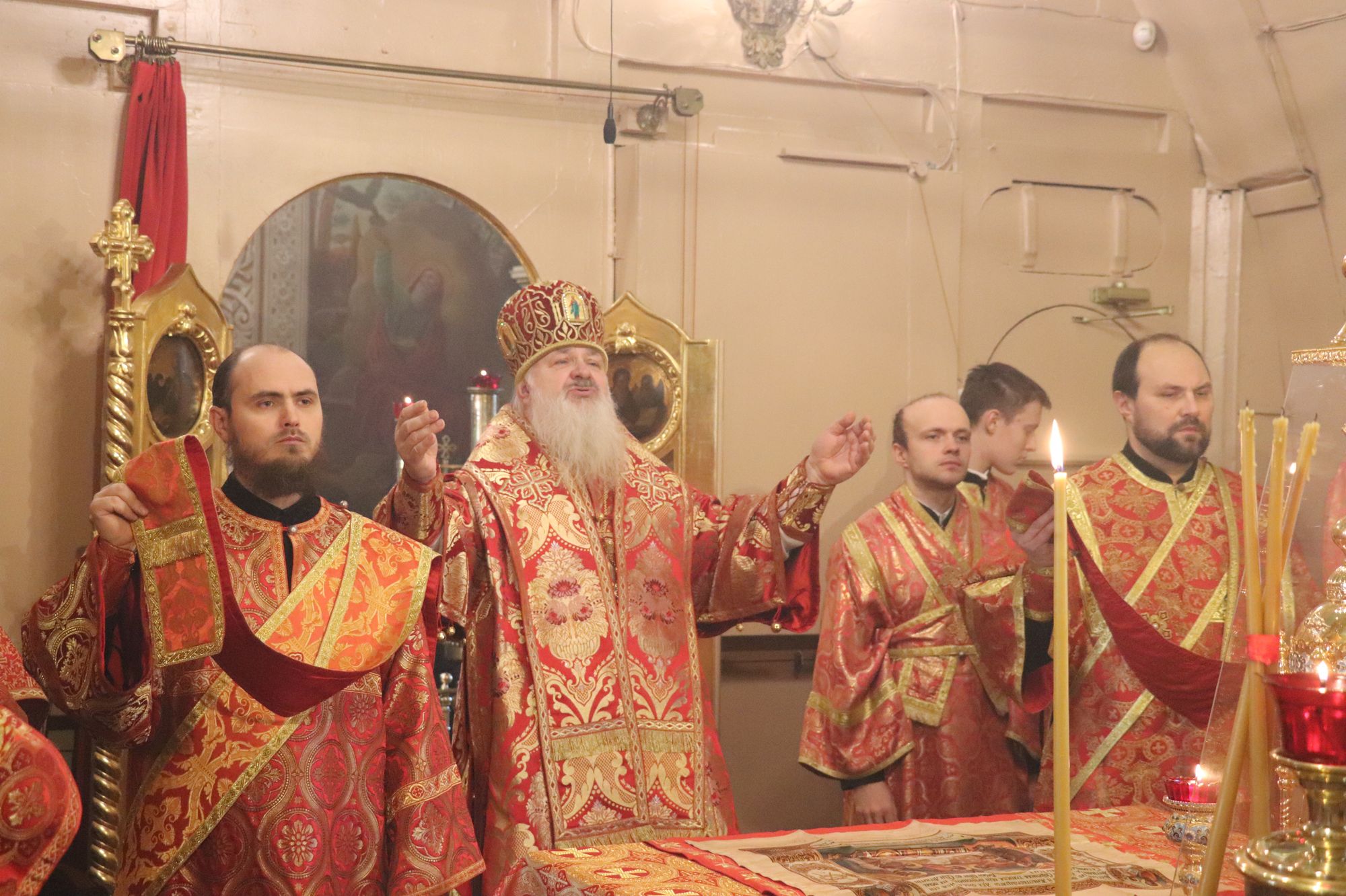 По окончании Божественной литургии был совершен молебен перед чтимым списком чудотворной иконы ?Введение Богородицы во Святая Святых?. Первообраз этой иконы был написан в 1377 г. по благословению святителя Алексия, Митрополита Московского. Поводом к этому послужил рассказ преподобного Варлаама, строителя и первого настоятеля Владычнего монастыря о бывшем ему видении при основании обители: ?Почто монастырь наречется Владычен, а не Алексиевский, занеже видех Владычицу, и Тоя бысть промыслом. Егда падох, и видех Ангелы держим монастырь, и Захария в дверех церковных стояща и Богородицу с рождшими Ю входящу, Захария же Богородицу приим и посади на третией степени?.