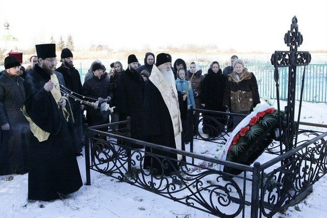 Затем митрополит Ювеналий и богомольцы направились на монастырское кладбище к месту погребения протодиакона Сергия, где была совершена заупокойная лития.