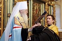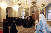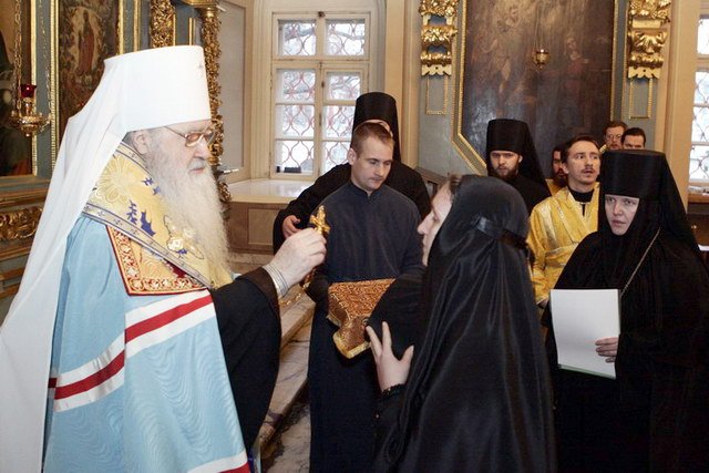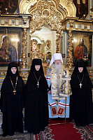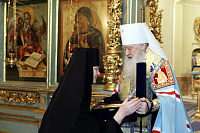 Тогда я видел, как в Спасо-Бородинском монастыре матушка Серафима успешно несет свое игуменское послушание. Буквально от ее сердца я оторвал этот монастырь, призвав на служение в Новодевичью обитель. Матушка Серафима тогда, конечно, без желания сюда переходила, но полностью приняла как волю Божию решение Святейшего Патриарха и Священного Синода. И все эти годы она усердно несла послушание, заботясь и о монашеском возрождении, и о благоукрашении этого храма, где мы осуществляем с утра до вечера молитвенный подвиг. И сегодня я хотел бы выразить Вам, дорогая матушка Серафима, личную благодарность за Ваше послушание, и за те годы, в которые Вы осуществляли здесь управление этой святой обителью.