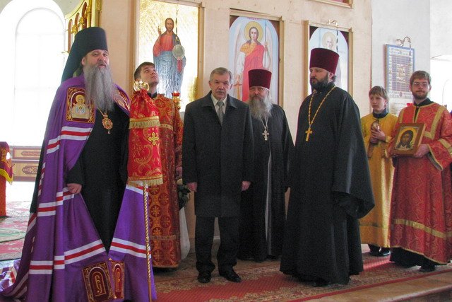 По окончанию Литургии Его Преосвященство обратился со словами приветствия к главе г. Бронницы В.Я. Егорову и ко всем молящимся. С ответным словом выступили глава города В.Я. Егоров и протоиерей Георгий Пищулин, преподнеся Владыке Роману пасхальное яйцо и икону Нерукотворного Спаса.