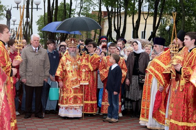 По окончании Божественной литургии, несмотря на непогоду, все с большим воодушевлением крестным ходом прошли на Никольскую площадь к памятнику св. Николы Можайского, где было совершено молебное пение. Владыка Григорий поздравил можайцев с Днем города и передал благословение, благопожелания и пасхальное приветствие митрополита Ювеналия. Радостными возгласами «Христос Воскресе! Воистину Воскресе!» огласились улицы древнего города. Также глава города В.В. Насонов со словами поздравления обратился к жителям Можайска и его гостям.