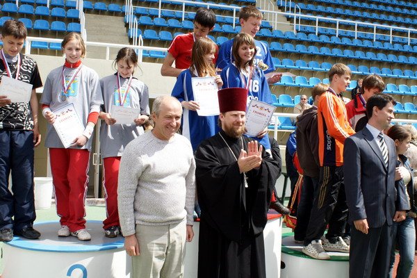 Главный судья соревнований объявил спартакиаду открытой. Прозвучал пасхальный тропарь подпевали все участники фестиваля. Под колокольный звон передвижной звонницы парад направился к спортивным площадкам. Колокольня на стадионе появилась усердием настоятеля Пантелеимоновской церкви города Жуковского протоиерея Николая Струкова. Батюшка во всем готовился встречать юных спортсменов как личных друзей недаром он возглавляет крупнейшую православную школу в епархии.
