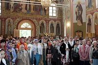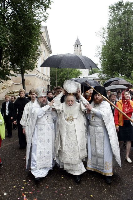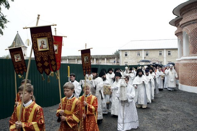Перед началом богослужения правящего архиерея Московской епархии у врат монастыря встречали Преосвященные архипастыри, духовенство, глава Дмитровского района В.В.Гаврилов с супругой, благотворители и труженики святой обители. Множество гостей и паломников прибыло на торжество, благодаря организованным автобусным маршрутам из Дмитрова. Учащиеся местных общеобразовательных и воскресных школ приветствовали Владыку Ювеналия перед входом в обитель. Воспитанники воскресной школы «Русский дом» при Успенском соборе Дмитрова выглядели особенно нарядно в красочных, русских национальных костюмах. Крестным ходом духовенство и верующие направились в Сергиевский храм, который предстал после реставрации удивительно благоукрашенным. Восстановительные работы, осуществленные в сверхкороткие сроки, позволили обители обрести замечательную святыню: храм преподобного Сергия не только приведен в надлежащий вид, но имеет чудесный иконостас канонического письма, новую утварь и даже расписан великолепными фресками.