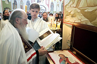 В сентябре прошлого года, совершая здесь первую после восьмидесятилетнего перерыва Божественную литургию, я не мог даже представить, что через короткое время храм приобретет такое благолепное состояние. Сегодня Валерий Васильевич назвал чудом то, что совершилось. Да, конечно, это Божие чудо, что у нас вновь находятся такие мастера, такие живописцы, что у нас вновь имеются добрые люди, которые не жалеют своих сил и средств для возрождения порушенных святынь.