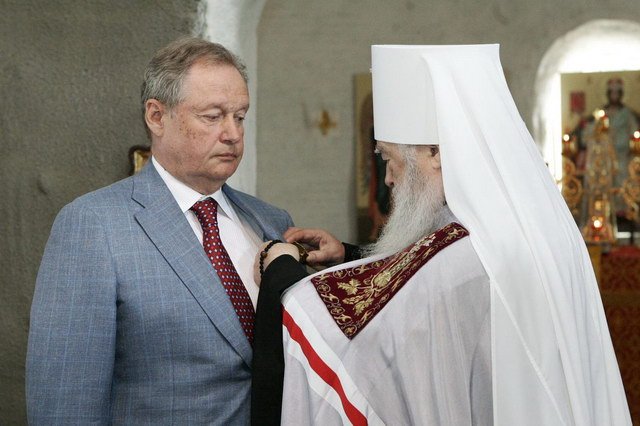Мы встречаемся здесь накануне юбилея Михаила Михайловича. Ему через несколько дней исполнится 60 лет. Это самый радостный и творческий возраст, когда человек, напоенный мудростью и опытом, многое еще может сделать. Поэтому сегодня в этой торжественной обстановке я хочу горячо и сердечно поблагодарить Вас, дорогой Михаил Михайлович, за то, что Вы взяли на себя подвиг восстановить эту древнюю святыню. Святейший Патриарх поручил мне выразить Вам благодарность за то, что в этой российской глубинке, где много еще храмов, ожидающих своего возрождения, Вы несете такой великий труд. Его Святейшество во внимание к Вашим церковным заслугам удостоил Вас награждения ордена преподобного и Богоносного отца нашего Серафима, Саровского чудотворца, II степени. Я с радостью вручаю Вам эту Патриаршую награду. Аксиос!