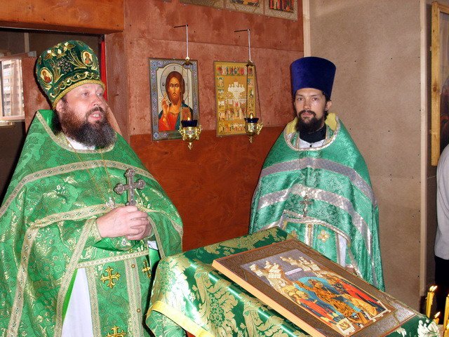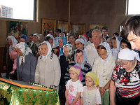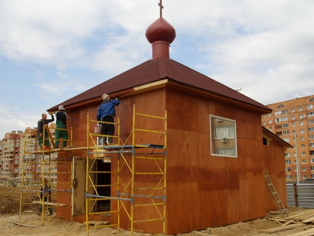 В мае было начато возведение временного деревянного храма для совершения богослужений на период строительства каменной церкви. В течение месяца жители микрорайона могли наблюдать, как у них на глазах строится храм. Уже через месяц 16 июня на день Святого Духа состоялось первое богослужение благочинный Домодедовского церковного округа протоиерей Александр Васильев и настоятель храма священник Максим Колесник совершили Божественную литургию. Храм был полон народа взрослые и дети усердно молились, причащались Святых Христовых Таин.