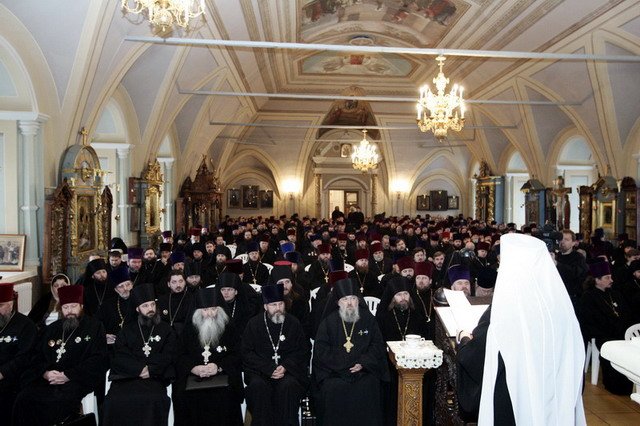 Согласно «Уставу Русской Православной Церкви» после кончины Святейшего Патриарха я вступил в управление приходами города Москвы, до того, как на Поместном Соборе будет избран новый Предстоятель. Я не стал нарушать традиции раздельных епархиальных собраний Московской епархии и 12 декабря в Зале Церковных Соборов Храма Христа Спасителя провел традиционное Епархиальное собрание города Москвы, как это намечал Святейший Патриарх. Сегодня мы собрались, чтобы подвести итоги уходящего года и обсудить вопросы церковной жизни нашей епархии.