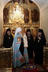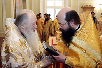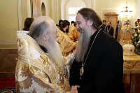 По окончании богослужения и возглашения уставных многолетий Владыка Григорий от имени Московской епархии поздравил митрополита Ювеналия с памятной датой в его жизни: