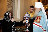 От имени всех присутствующих Владыка архиепископ преподнес митрополиту Ювеналию святую просфору и образ Воскресения Христова.
