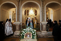 От лица насельниц Московского Новодевичьего монастыря правящего архиерея Московской епархии поздравила игумения Маргарита (Феоктистова). Она отметила непрестанные труды Его Высокопреосвященства по церковному возрождению в Подмосковье, сравнив их с подвигом небесного покровителя Владыки — святителя Ювеналия, патриарха Иерусалимского. На молитвенную память матушка преподнесла Владыке митрополиту икону с изображением святых новомучеников Новодевичьей обители.