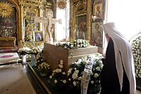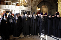 По прибытии в собор Его Высокопреосвященство направился в Благовещенский придел, к месту погребения Святейшего Патриарха Алексия II. Здесь Владыка Ювеналий, поклонившись почившему Первосвятителю, возложил к надгробию цветы от лица Московской епархии.