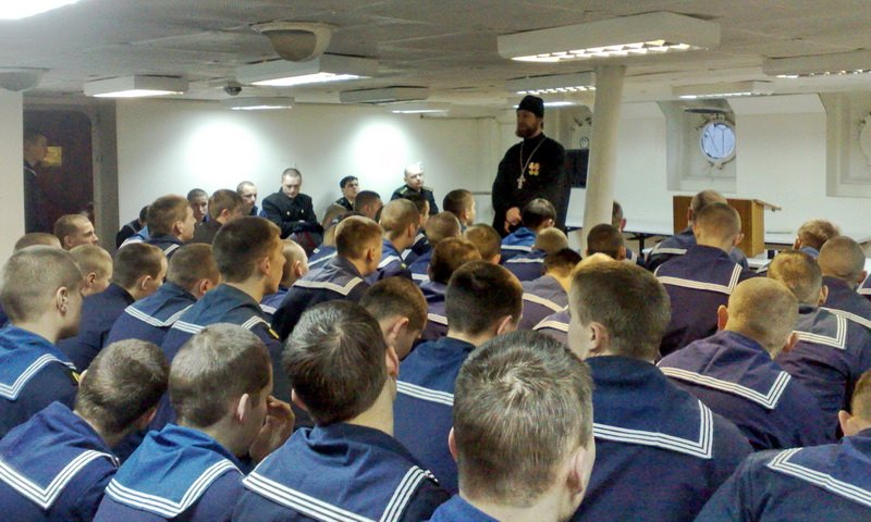 Торжественное собрание экипажа, посвященное Дню корабля, по уже сложившейся традиции началось с благодарственного молебна о здравии моряков-североморцев перед иконами покровителей военно-морского флота апостола Андрея Первозванного, святителя Николая Чудотворца и святого праведного Феодора Ушакова с частицами мощей. Выступая перед командой подшефного корабля, священник Димитрий пожелал морякам помощи Божией в их нелегкой службе, внимания и терпения друг к другу. В дар воинам были переданы нательные крестики и иконы святителя Николая Чудотворца. По согласованию с командованием корабля благотворителями были выделены средства на ремонт столовой экипажа, и к приезду шефов работы были выполнены. После собрания в столовой выступил с концертом автор и исполнитель песен Павел Буценко, прихожанин церкви Архистратига Михаила деревни Летово.
