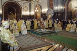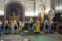 Затем Святейший Владыка обратился с Первосвятительским словом к участникам богослужения: «Ваши Высокопреосвященства и Преосвященства! Досточтимые отцы, дорогие братья и сестры!