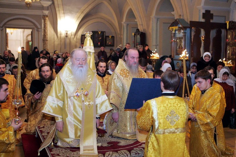 «Ваше Высокопреосвященство, мать игумения, всечестные отцы, сестры святой обители, дорогие и возлюбленные братья и сестры! Весь мир готовится к встрече Нового года по гражданскому летоисчислению. Осталось всего несколько часов до начала нового десятилетия в XXI веке. По-разному готовятся люди встречать новый год: одни спешат совершить последние закупки перед встречей Новолетия, повеселиться, а другие, особенно те, которые сегодня собрались в этой святой обители, как бы предстоят перед Господом, размышляя о прожитом и испрашивая Божия благословения на грядущее время своей жизни. Можно только благоговеть перед вашим подвигом, что вы сегодня собрались в храм Божий, чтобы вознести молитвы Господу, чтобы достойно подготовить себя в эти оставшиеся до Рождества Христова дни к великому и спасительному празднику Рождества Христова. Размышляя о минувшем годе, мы можем только вознести глубокую молитву благодарения, что несмотря на все испытания и трудности, которые встречались на нашем жизненном пути, Господь помогал нам нести наш жизненный крест. Вера Христова давала нам и осмыслить страдания и испытания, и еще больше укрепляться в надежде на Промысел Божий, потому что мы знаем, что здесь на земле мы временные гости, мы готовим себя к вечной, нескончаемой жизни в Царствии Небесном, и Святая Церковь ведет нас спасительным путем, напоминая заповеди, которые еще в древности даны людям, учение Христово, подкрепляя молитвой и благодатными Таинствами, в которых участвуют православные христиане. На пороге нового года по гражданскому летоисчислению мы предаем себя в руки Живого Бога, надеясь, что Промысл Божий будет вести нас ко спасению, помогая нам переносить любые испытания, с тем, чтобы духовно очищаться, возрастать в вере, благочестии, в любви, в чистоте, в смирении, кротости, незлобии. Эти святые мгновения, которые вы провели сегодня в храме Божием, пусть останутся святым воспоминанием в ваших сердцах, что вы не только за себя, но и за ближних своих, за всех жителей этого богоспасаемого града вознесли свои молитвы, чтобы Господь благословил лето наступающей благости Своей миром, спокойствием, чтобы дал всем нам здравие, спасение и во всем благое поспешение. Я горячо вас поздравляю с наступающим Новым годом, и кто из вас будет иметь возможность, и завтра приходите на нашу молитву, чтобы при наступлении Нового года опять начать нам с совместной молитвы, испрашивая Божия благословения на нашу жизнь, на наше служение, на наши труды. Пусть Господь благословит миром своим землю нашу, благословит каждого из вас Своей благодатию и человеколюбием. Благослови венец лета благости Твоея, Господи! Аминь».