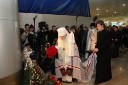 Митрополит Крутицкий и Коломенский Ювеналий прибыл для совершения заупокойной молитвы на место трагедии — в аэропорт «Домодедово». Перед началом заупокойной литии Владыка митрополит возложил цветы на место взрыва и обратился к собравшимся с архипастырским словом: