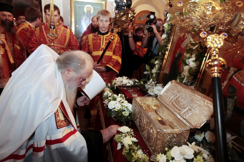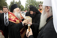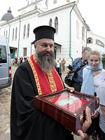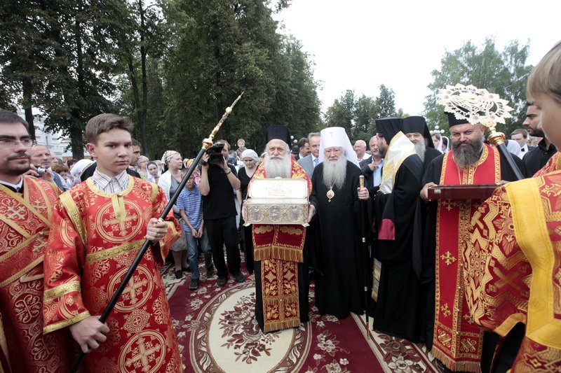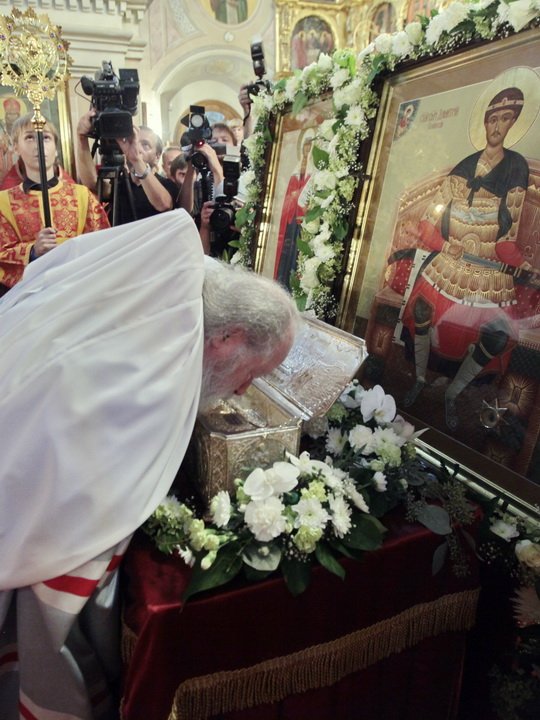 Веками русский народ чтил святого великомученика Димитрия Солунского и обращался к нему с молитвой, но это он делал мысленно, зная о его чудесах и его чудесной помощи. И я хочу, дорогой Владыка, сказать, как счастливы мы сегодня, что можем лобызать десницу великомученика и обращаться к нему, как к живому. Я хочу от лица Святейшего Патриарха, от лица всего духовенства, от множества верующих, которые, с радостью узнали весть о прибытии мощей святого великомученика, горячо, сердечно,
