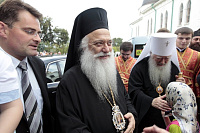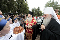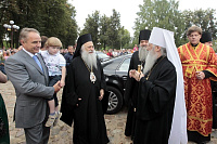 Возлюбленный Владыка Пантелеимон! Я рад, что вас сегодня окружают братья архиереи: Владыка Афанасий, который является представителем Святой Александрийской Церкви при Московском Патриаршем престоле, епископ Серпуховской Роман, викарий Московской епархии, и духовенство. Вы видели то множество людей, которые, узнав о прибытии мощей, по велению своего сердца прибыли сюда, чтобы поклониться святому великомученику Димитрию, покровителю этого града и всей нашей Русской земли. Мы счастливы, что наши светские руководители не только помогают возрождению веры, но и показывают ревность о Господе. Наглядным примером является глава города Дмитрова Валерий Васильевич, который приезжал к вам, передавая мое обращение, потому что Святейший Патриарх Кирилл благословил святое намерение принести святые мощи. Вы принимали Валерия Васильевича в своей епархии, и сегодня мы вместе с ним сердечно вас приветствуем с прибытием на Подмосковную землю.