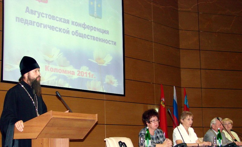 С приветственным словом участникам конференции выступил и благочинный церквей Коломенского округа протоиерей Владимир Пахачев. Он поздравил педагогов с отмечавшимся накануне двунадесятым праздником — Успением Пресвятой Богородицы, напомнил, что этот праздник является престольным для Коломны и пожелал всем работникам образования помощи Божией в их героическом труде. Высоко оценив сотрудничество школы и Церкви в деле духовно-нравственного воспитания детей, отец Владимир поблагодарил работника Муниципального методического центра, в течение многих лет осуществлявшую это взаимодействие — А. Т. Киктенко за её работу. Со словами большой признательности отец Владимир вручил Анне Тимофеевне благословенную грамоту «За труды на ниве православного образования и духовно-нравственного просвещения», подписанную председателем Синодального отдела религиозного образования и катехизации епископом Зарайским Меркурием.