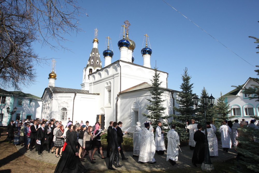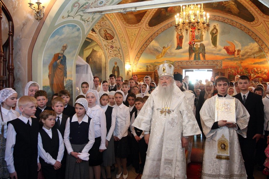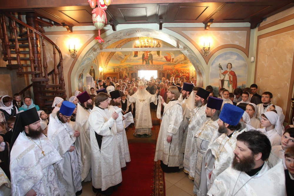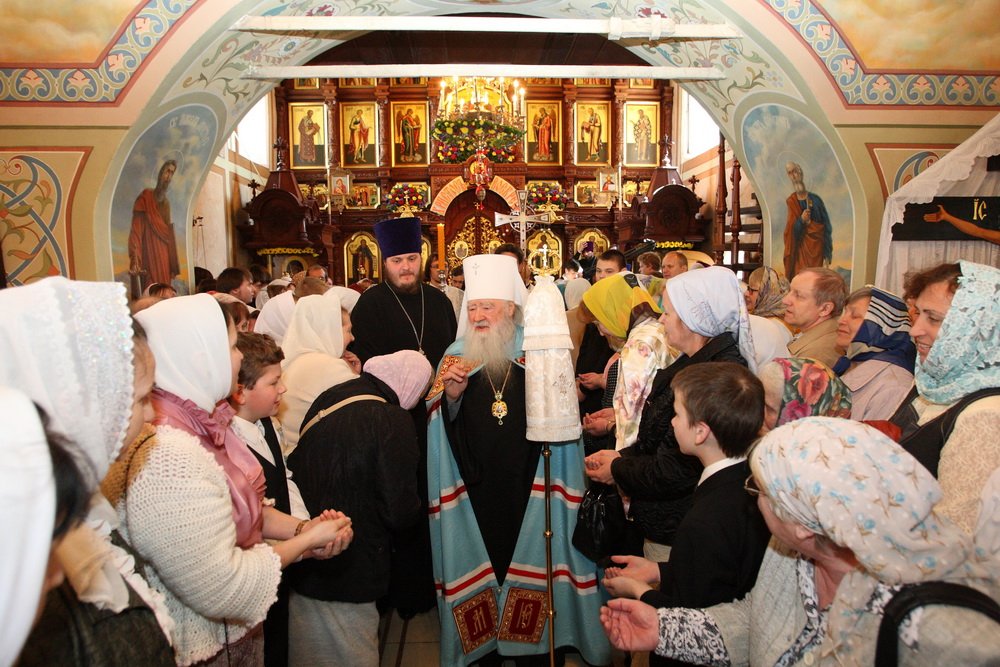 «Дорогой отец Нестор, дорогой отец Игорь, отцы благочинные, всечестные отцы, уважаемы руководители Одинцовской земли, возлюбленные и дорогие братья и сестры! Христос Воскресе! Всегда, когда посещаешь приходы нашей епархии, хочется ближе знакомиться с жизнью прихожан и этой местности. Ваш святой древний храм, на который столько выпало испытаний, 200 лет назад был разграблен войсками Наполеона, которые пришли к нам как завоеватели, а в ХХ веке церковь пострадала от своих соотечественников-атеистов и храм был закрыт. 20 лет назад здесь началась церковная жизнь. Я не видел, в каком состоянии был этот храм 20 лет назад, но вижу всюду вашу жертвенность, вашу любовь в созидании и восстановлении его. Когда возвращались к нам разрушенные святыни, я призывал внуков и сыновей за грех богохульства отцов и дедов жертвенно восстанавливать порушенные святыни. Одно духовенство не смогло бы с этим справиться. Но я верю, что Бог влагал желание в сердца людей, которые услышали мой призыв и исполнили свой долг. Сегодня после ваших многочисленных усердных трудов мы совершили великое освящение этого храма. Я очень счастлив, что здесь сегодня присутствовала молодость нашей Церкви. Когда то, в дни моей юности приходилось слышать, что Русская Православная Церковь — это Церковь бабушек, а когда умрут эти бабушки, Церковь умрёт. Те, кто так говорили, не верили в обетование Христово, Который сказал: „Я созижду Церковь Мою и врата ада не одолеют её“ (Мф. 16:18). Мы знаем, сколько врата ада разрушали Церковь, убивали священнослужителей и монашествующих. Но вера, которую принес на землю Христос, неистребима в нашем народе. Мы празднуем сейчас Пасху Господню, и в течение сорока дней поём пасхальные гимны в воспоминание того, что до Вознесения на небо Христос по Воскресении Своём из мертвых сорок дней являлся ученикам Своим, верующим и народу, уча их о Царствии Божием. И мы тоже в эти дни вспоминаем то Божественное учение, которое принёс на землю Христос Спаситель. Сегодняшним днем завершается неделя, когда мы воспоминаем, как Христос явился апостолу Фоме вместе с другими учениками. До этого апостол Фома не мог поверить, что его Божественный Учитель воскрес. Когда ему рассказывали, что видели Господа, он отвечал, что до тех пор, пока сам не прикоснется к Его ранам, не поверит. Он, конечно, хотел этому поверить, но был потрясён и угнетён картиной Распятия Христова. И он жил в течение нескольких дней в страданиях ожидания встречи со Христом. В ответ на этот духовный поиск Господь явился ему и сказал: „Вложи руки свои в язвы Мои и не будь неверен, но верен“ (Ин. 20:27). А тот воскликнул: „Господь мой и Бог мой“ (Ин. 20:28). И услышал в ответ: „Ты поверил, потому что увидел, но блаженны невидящие и верующие“ (Ин. 20:29). Это сказано, возлюбленные, о нас с вами, которым от времен апостолов, из поколения в поколение передано и дошло до нас, что Христос воистину Воскрес. С такой радостью, с таким воодушевлением, с такой верой мы отвечаем друг другу, когда приветствуем: „Христос Воскресе! Воистину Воскресе!“ Радость объемлет наши сердца. Эта радость не земная, эта радость духовная. Эта радость, которую не может мир дать. Эта радость, которую не может никто отнять. Я очень счастлив, что вижу вас сегодня в этом святом храме. Благодарю Бога за вас и ваших детей, что вера Христова наполняет ваши сердца. В
