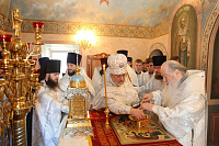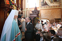 Владыка митрополит наградил настоятеля храма медалью «За усердное служение» III степени. Благодарственные и благословенные грамоты получили и прихожане, которые активно участвовали в восстановлении храма.