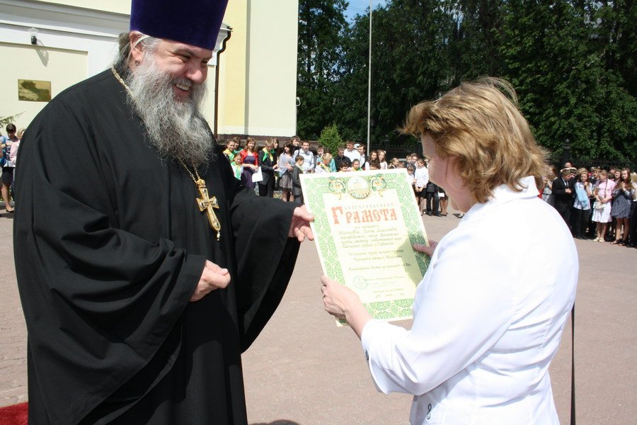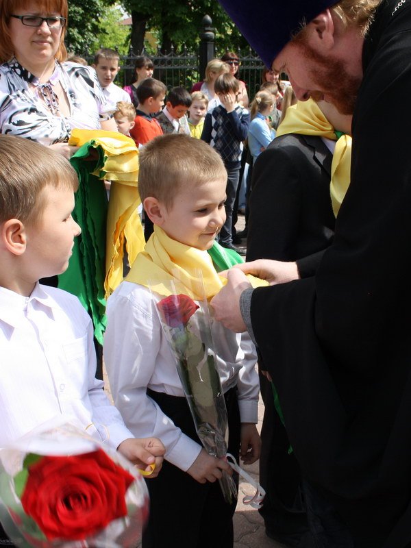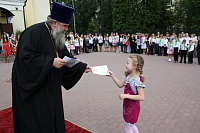 Вначале торжественной линейки был исполнен гимн молодежной организации «Протос» и выпускниками школы Яковом Разумейко и Марией Шамрай поднят флаг организации. Протоиерей Александр поприветствовал собравшихся, поздравил с окончанием очередного учебного года и сказал напутственные слова выпускникам.