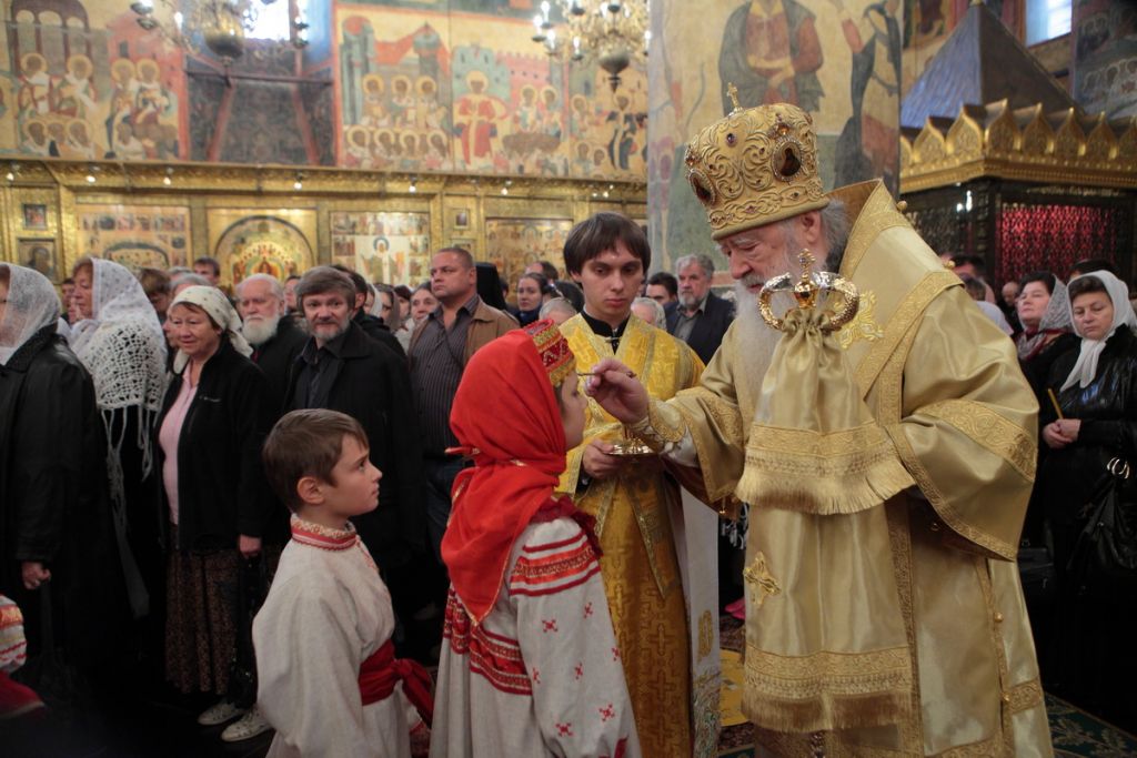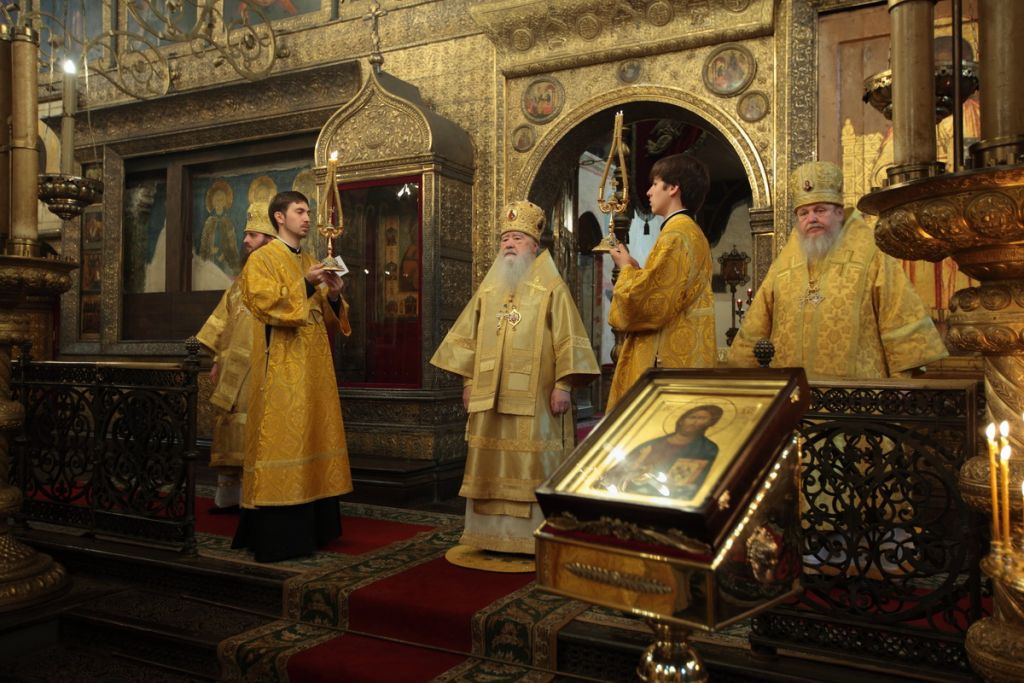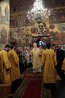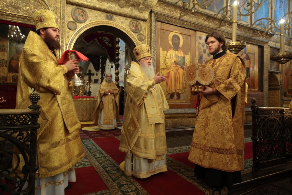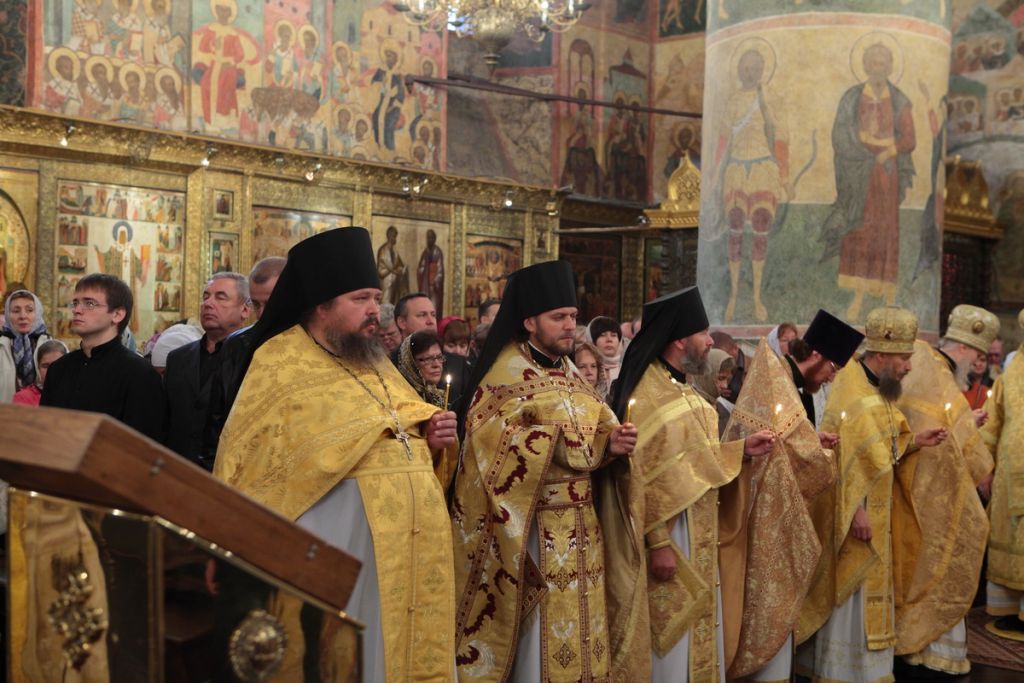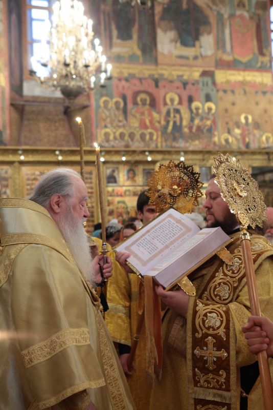 «Возлюбленные братия архипастыри, всечестные отцы, дорогие и возлюбленные братия и сестры. Святейший патриарх Кирилл дал нам сегодня великую радость — в этом историческом древнем патриаршем соборе совершить Божественную литургию и помолиться у мощей Предстоятелей нашей Церкви и испросить Божие благословение для каждого из нас, для Церкви нашей, для великой державы Российской и народа ее. Я сердечно поздравляю вас с праздником, с днем тезоименитства, причастников и причастниц — с принятием Святых Христовых Тайн. И дай Бог всем нам в мире душевном проводить христианскую жизнь, готовя себя к вечной жизни, к Царствию Небесному. Сегодня за Божественной литургией в святом Евангелии приводились слова Спасителя о том, чтобы Его последователи были как светильники, чтобы свет их видели все. И есть слова, которые нас предупреждают и радуют. Предупреждают о том, что если кто не исполнит заповедей и научит этому других, тот меньший будет в Царствии Божием. Это намек на то, что и Царствия Божия он не наследует, потому что горе тому, от кого исходят соблазны в учении, в высказываниях и в личной жизни. Но другим говорится так: „А кто исполнит заповеди и научит этому людей, тот великим наречется в Царствии Божием“ (Мф 5:19). Мы можем подумать: „Как же все это совершить? Как достигнуть Царствия Небесного? Как быть светом, чтобы видя его, люди прославляли Отца нашего Небесного?“ Но возьмите Церковный календарь, откройте на любой странице и вы увидите, что каждый день совершается память святых. Нет ни одного дня в году, когда бы мы не праздновали памяти тех, которые исполнили заповеди Божии и сейчас нас этому научают и являются нашими небесными предстателями перед Престолом Божиим. Вот и сегодня, помимо многих святых, память совершали специально святителю Киприану и прославляли мученицу Людмилу. Святитель Киприан на святой горе Афон научился молитве, смирению, книжному искусству и все это, передал другим, научил других, особенно когда он был Первосвятителем Московским. Терпя многие скорби, о которых свидетельствуют историки, он больше всего заботился, чтобы его действиями, чтобы его служением не было разделения, и он сохранил в единстве нашу святую Церковь. Больше того, он