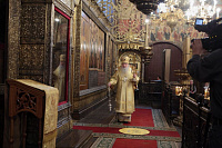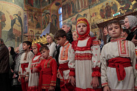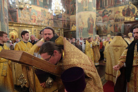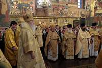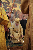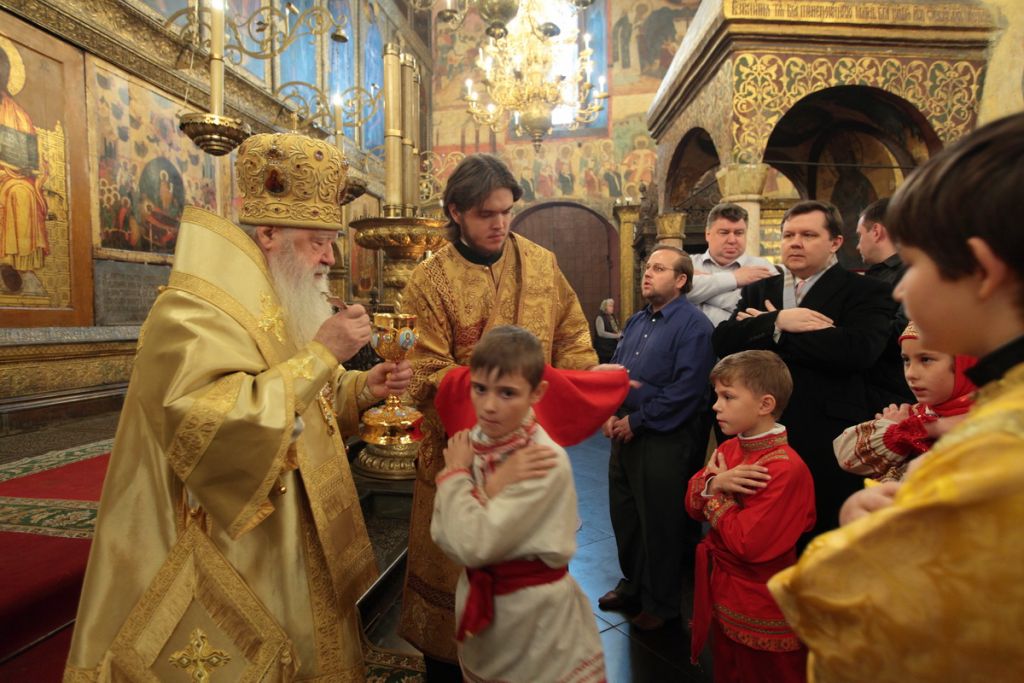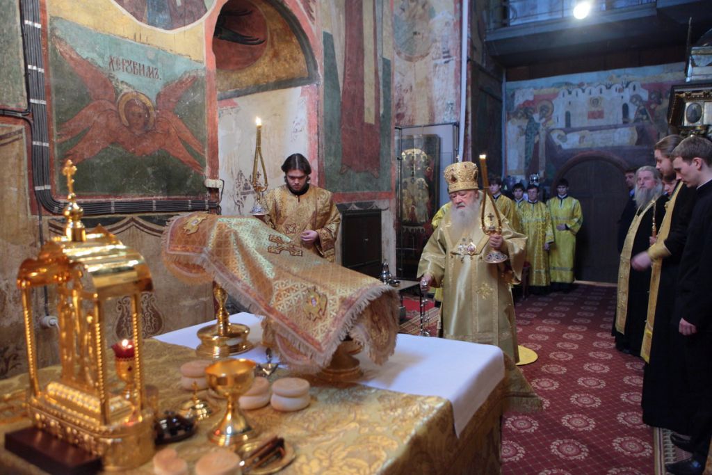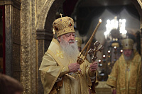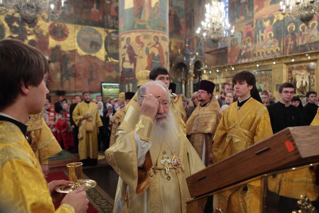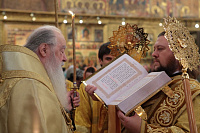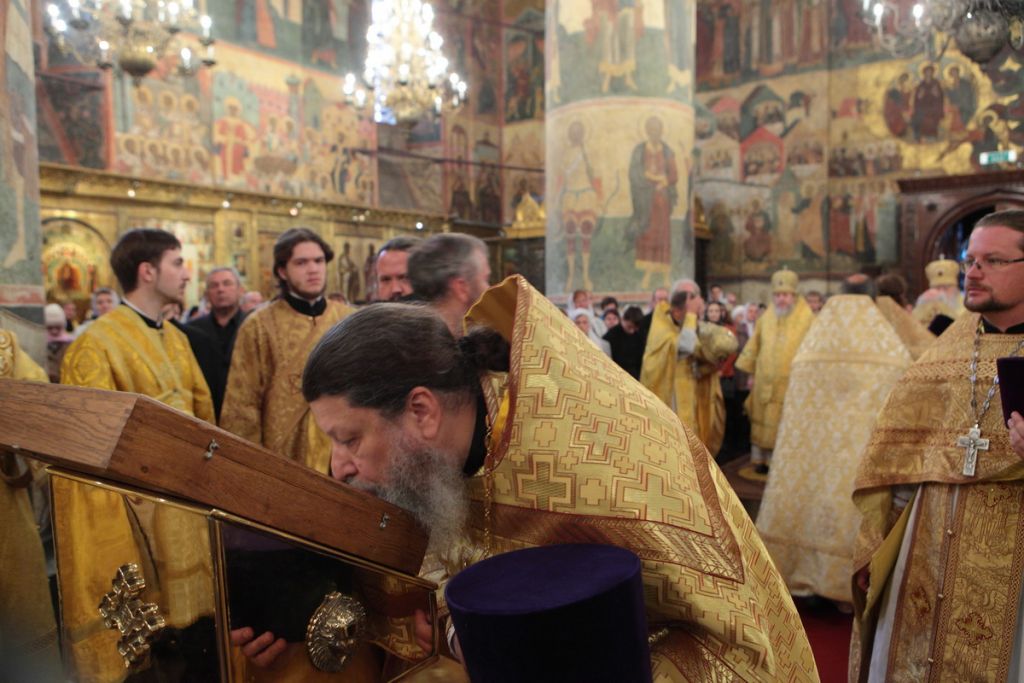 «Возлюбленные братия архипастыри, всечестные отцы, дорогие и возлюбленные братия и сестры. Святейший патриарх Кирилл дал нам сегодня великую радость — в этом историческом древнем патриаршем соборе совершить Божественную литургию и помолиться у мощей Предстоятелей нашей Церкви и испросить Божие благословение для каждого из нас, для Церкви нашей, для великой державы Российской и народа ее. Я сердечно поздравляю вас с праздником, с днем тезоименитства, причастников и причастниц — с принятием Святых Христовых Тайн. И дай Бог всем нам в мире душевном проводить христианскую жизнь, готовя себя к вечной жизни, к Царствию Небесному. Сегодня за Божественной литургией в святом Евангелии приводились слова Спасителя о том, чтобы Его последователи были как светильники, чтобы свет их видели все. И есть слова, которые нас предупреждают и радуют. Предупреждают о том, что если кто не исполнит заповедей и научит этому других, тот меньший будет в Царствии Божием. Это намек на то, что и Царствия Божия он не наследует, потому что горе тому, от кого исходят соблазны в учении, в высказываниях и в личной жизни. Но другим говорится так: „А кто исполнит заповеди и научит этому людей, тот великим наречется в Царствии Божием“ (Мф 5:19). Мы можем подумать: „Как же все это совершить? Как достигнуть Царствия Небесного? Как быть светом, чтобы видя его, люди прославляли Отца нашего Небесного?“ Но возьмите Церковный календарь, откройте на любой странице и вы увидите, что каждый день совершается память святых. Нет ни одного дня в году, когда бы мы не праздновали памяти тех, которые исполнили заповеди Божии и сейчас нас этому научают и являются нашими небесными предстателями перед Престолом Божиим. Вот и сегодня, помимо многих святых, память совершали специально святителю Киприану и прославляли мученицу Людмилу. Святитель Киприан на святой горе Афон научился молитве, смирению, книжному искусству и все это, передал другим, научил других, особенно когда он был Первосвятителем Московским. Терпя многие скорби, о которых свидетельствуют историки, он больше всего заботился, чтобы его действиями, чтобы его служением не было разделения, и он сохранил в единстве нашу святую Церковь. Больше того, он