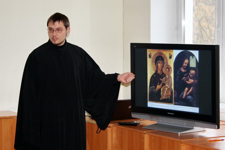Первая половина лекции — об этапах изготовления икон прошла в здании воскресной школы собора, а вторая — в самом храме, где отец Виталий на примере храмовых икон показал те техники, о которых говорил ранее.