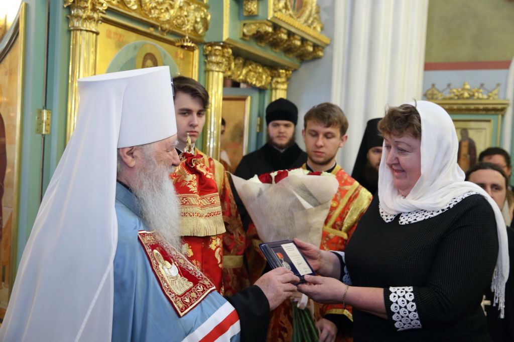 «Мне хочется поощрить еще одну женщину — Тамару Ивановну, которая много делает для того, чтобы благоуспешно было здесь служение. Ваши просфоры, как говорил сейчас Игорь Викторович, по всему миру известны, и я очень рад, что это все делается с любовью и Божиим благословением. Вы отметили свой юбилей, я Вас от души поздравляю, надеюсь, что Вы и дальше будете еще больше трудиться. Сил у Вас много, любви много, так что Господь Вам во всем поможет. А за Ваши жертвенные труды примите медаль „За жертвенные труды“, которой награждаются миряне за их усердие.