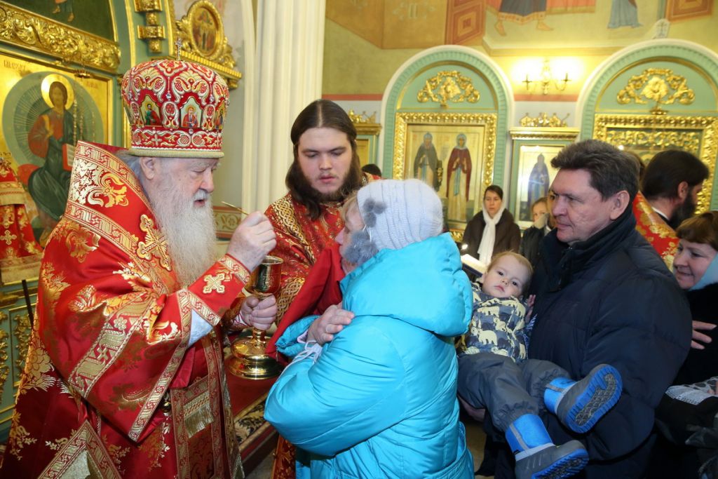 Я благодарю за слова приветствия, за ваши дары, за ваши труды, которые вы несете во благо ближних своих. И так совпало, что сегодня много именинниц, причастников, я всех поздравляю, причастников — с принятием святых Христовых Таин, именинниц — с днем тезоименитства.