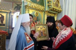 И хотел бы особенно отметить Татьяну Борисовну, которая много трудится на благо горожан и известна своей любовью к Церкви Христовой. Позвольте, дорогая Татьяна Борисовна, преподнести Вам этот образ иконы Божией Матери «Всех Скорбящих Радосте». В Вашей жизни, в Ваших трудах много скорбей, но от трудов Вы получаете и радость, и пусть Вам во всем помогает Владычица наша Пресвятая Богородица, и примите эти цветы.»