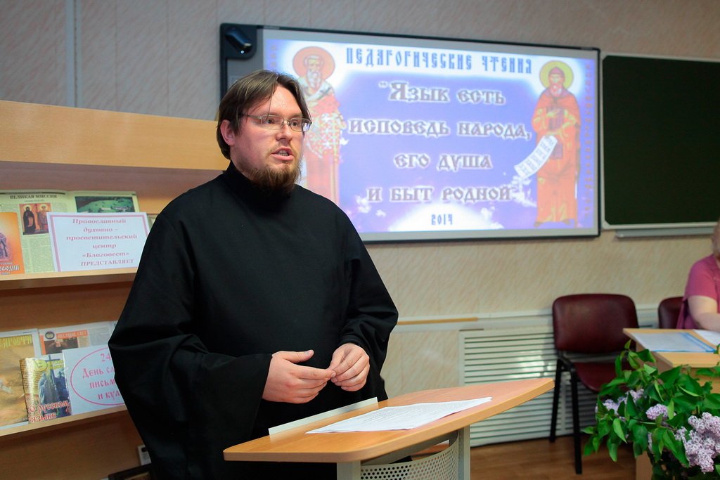 Доклад клирика Троицкого собора г. Щелково диакона Александра Амелина перенес слушателей во времена черноризца Храбра. Читая и комментируя отрывки его произведения «О письменах», отец Александр смог показать педагогам красоту старославянского языка и любовь автора к славянской письменности.