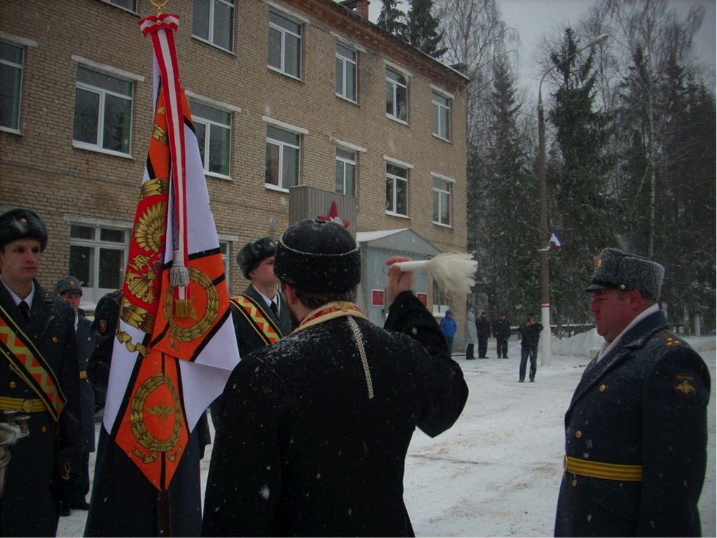 25 декабря в г. Чехов-3 состоялось вручение нового знамени войсковой части № 33077. После молебна, который совершил настоятель Георгиевского храма г. Чехов-3 священник Михаил Гимонов, знамя было передано командиру части полковнику А. Н. Олейнику.