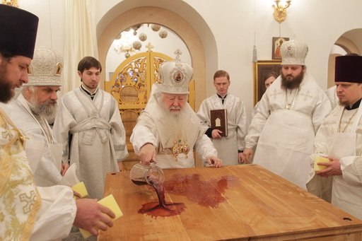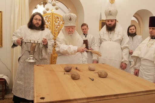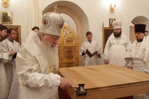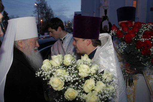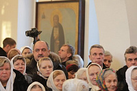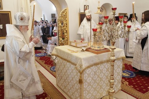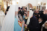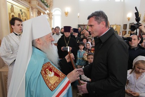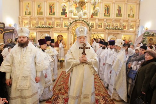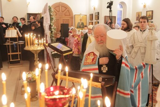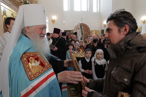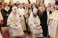 Но также огромным значением для нас, дорогие братья и сестры, является Храм Божий. Мы только что слышали от отца Иоанна о том, как он рассказывал, что тот храм, который здесь был, в 1936 году был уничтожен. Но вера Христова неуничтожима, потому что Господь сказал: „Я создам Церковь Мою, и врата ада не одолеют Ее“ (Мф. 16;18). И на этом месте, где даже фундамента не осталось от прошлой церкви, мы сегодня освящаем сразу два святых храма. И я, когда читал справочный материал о строительстве, обратил внимание на то, что Юрий Кузьмич Владимиров, народный артист СССР в течение всего периода строительства этого храма давал свои сбережения как жертву Богу. И конечно, много и других было благотворителей, те, которые не могли деньги дать, помогали своим трудом, своими молитвами. И вот теперь все мы торжествуем, прославляя Господа и Его Пречистую Матерь и святителя Московского Филарета, которым посвящены два храма, которые сегодня стоят в одной ограде.