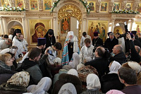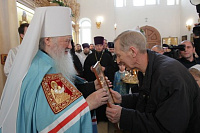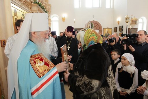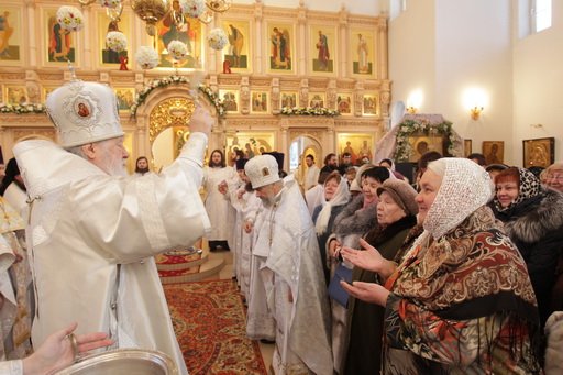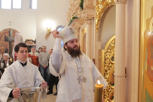 Я хотел бы поздравить всех вас с праздником. Это ваш праздник, праздник нашей веры, праздник нашей души, потому что сегодня мы торжествуем завершение созидательного святого труда. Скоро завершится и Рождественский пост, и мы войдем в радость Господа нашего, отмечая Его Рождество. Через несколько дней по гражданскому летоисчислению начинается новый год, и мне хочется всем нам пожелать душевного мира, мирных отношений между собой, мира на нашей земле, всем вам Божьего благословения, здоровья и счастья. Я поздравляю причастников и причастниц с принятием Святых Христовых Таин, благодарю Вас, отец Роман, за Ваш дар — дивный образ иконы Божией Матери „Нечаянная радость“, который будет мне напоминать о нашей сегодняшней совместной молитве. Благодарю Преосвященного владыку Константина, который сегодня участвовал в освящении наших храмов. Благодарю духовенство, благочинных соседних благочиний, которые прибыли сюда для совместной молитвы, и всех вас, возлюбленные, благодарю за любовь к Церкви Божией и желаю, чтобы Православная вера вдохновляла вас в жизни и в ваших трудах. Храни вас всех Господь! С праздником!».