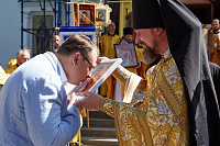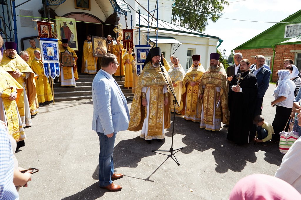 У храма Рождества Пресвятой Богородицы был совершен молебен, после чего глава района обратился к собравшимся с праздничным поздравлением.
