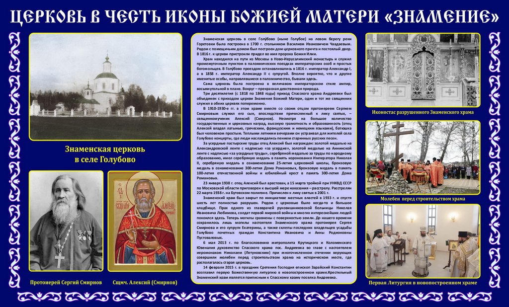 26 июля состоялось освящение новопостроенного крестильного храма в честь иконы Божией Матери «Знамение» в деревне Голубое Солнечногорского района. По благословению митрополита Ювеналия, чин освящения совершил благочинный Солнечногорского округа протоиерей Антоний Тирков в сослужении благочинного церквей Люберецкого округа протоиерея Димитрия Мурзюкова и духовенства храма.
