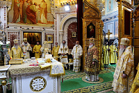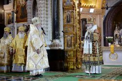 Песнопения Литургии исполнили Хор духовенства Московской епархии (регент — священник Сергий Голев) и Патриарший хор Храма Христа Спасителя (регент —