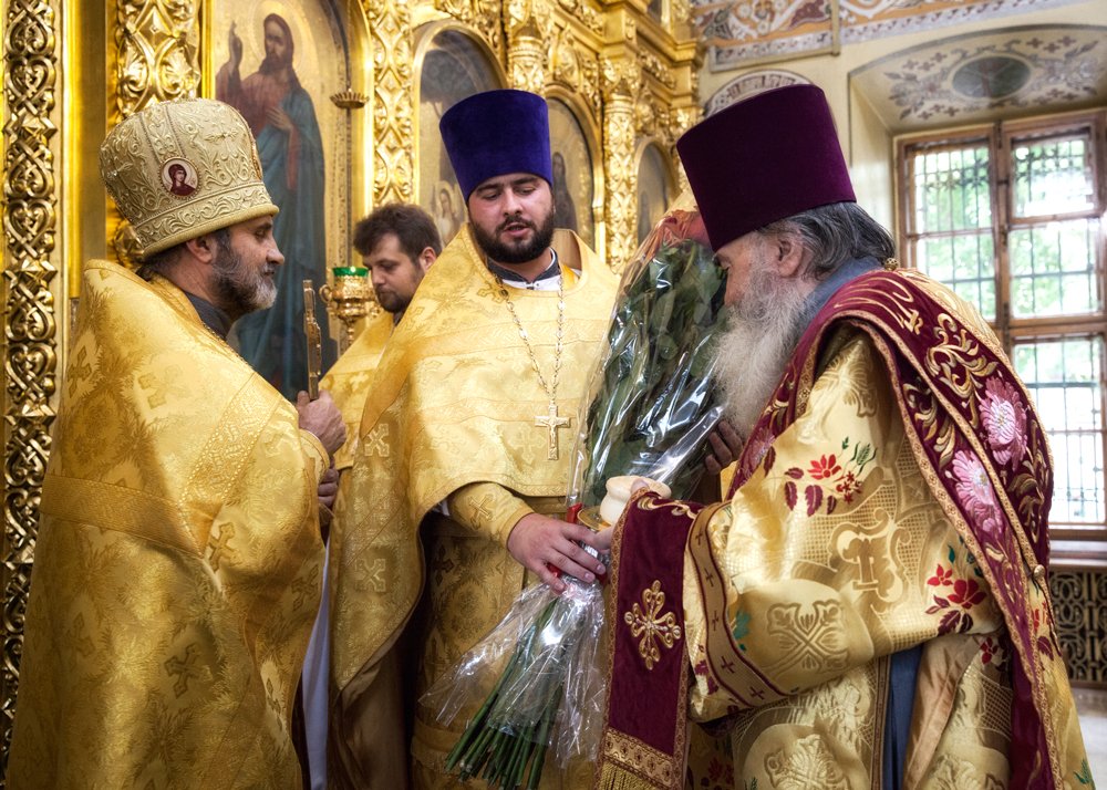 Отец Николай обратился к именинникам — клирикам собора священнику Владимиру Тимченко и протодиакону Владимиру Ганабе — с поздравительным словом, а ключарь собора священник Константин Александров, от лица настоятеля собора, духовенства и прихожан, преподнес им букеты цветов.